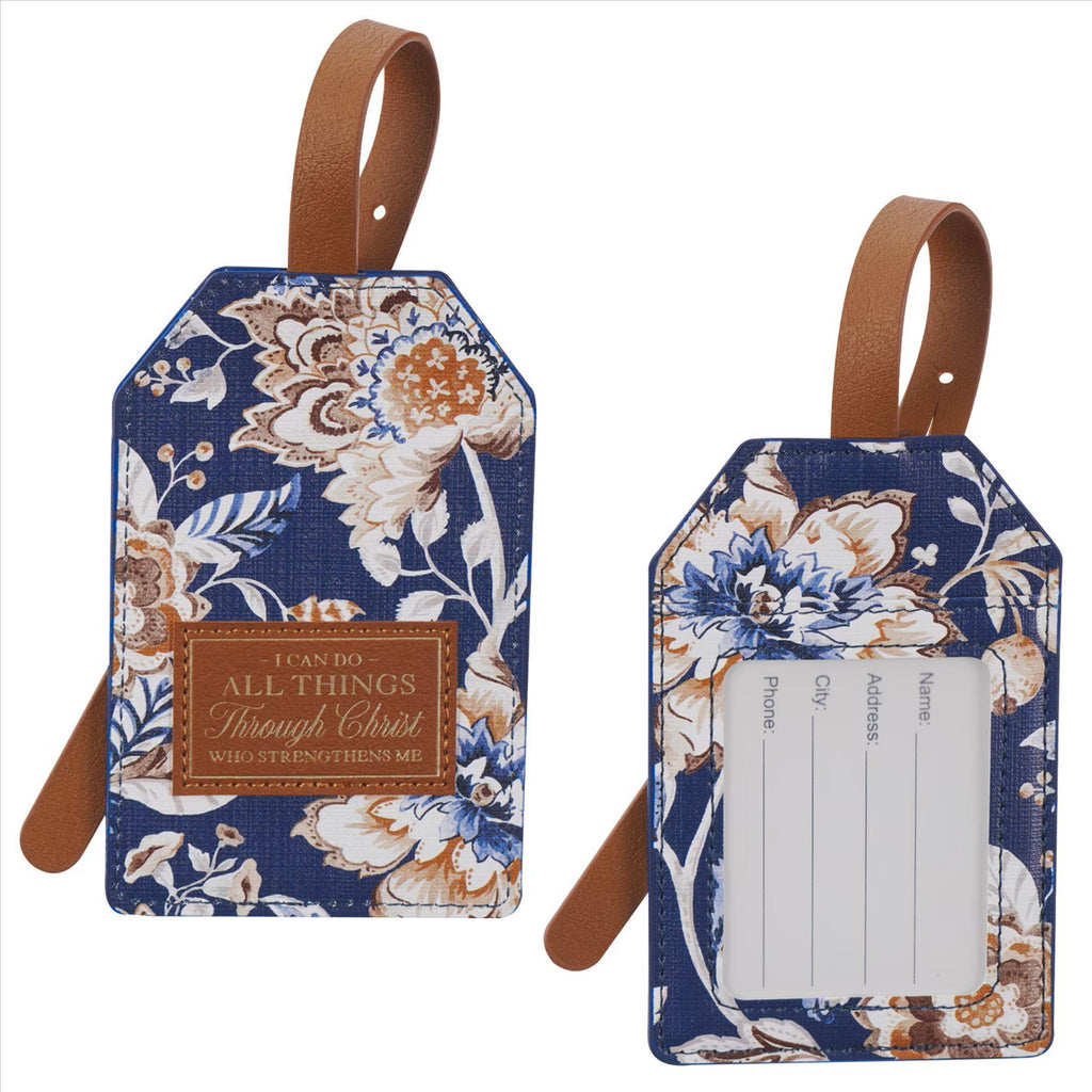 Un elegante diseño floral en marrón y azul sobre un fondo azul marino adorna el exterior de la etiqueta de equipaje. Un marco marrón miel delineado en papel dorado muestra el mensaje en letras doradas en la parte inferior del diseño: "Todo lo puedo en Cristo que me fortalece" (Filipenses 4, 13).