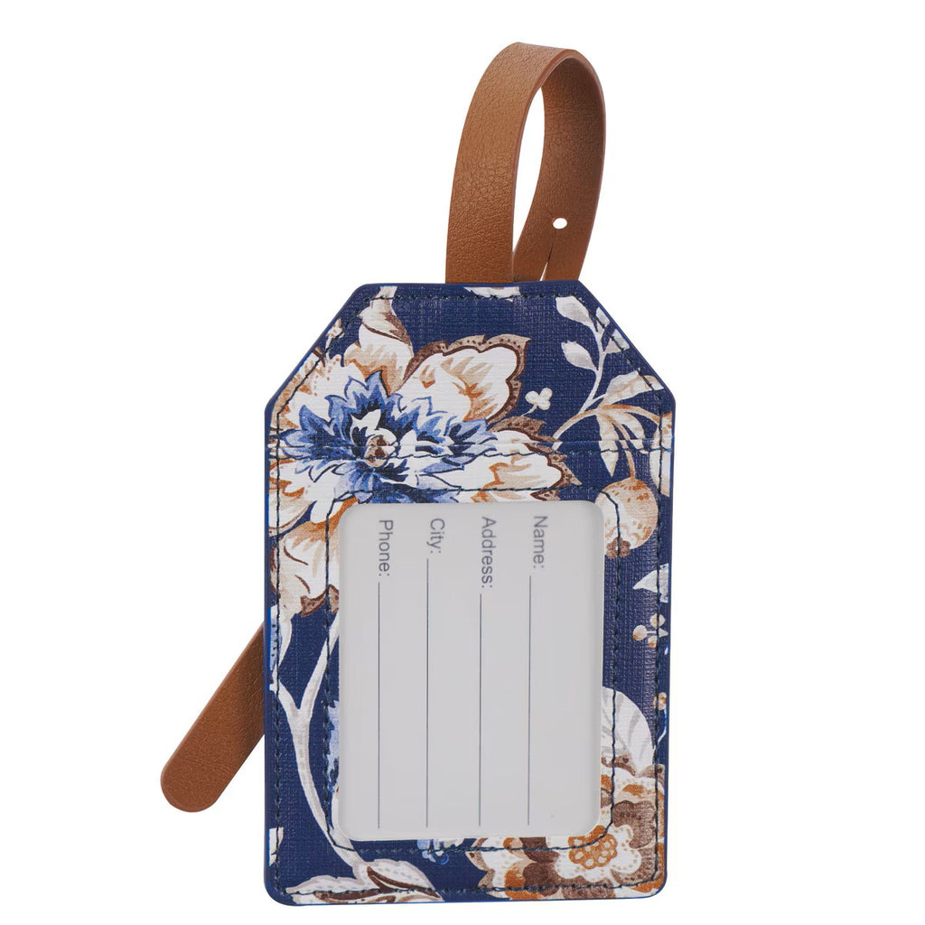 El elegante diseño floral se repite en el reverso de la etiqueta de equipaje. Este lado muestra una ventana de plástico transparente combinada con una tarjeta deslizable para tu información de contacto. Los bordes y las costuras están reforzados con pespuntes en azul marino para garantizar su durabilidad. La etiqueta se completa con una correa de cuero vegano marrón miel equipada con una hebilla de metal resistente que se sujetará de forma segura a tu maleta o equipaje de mano.