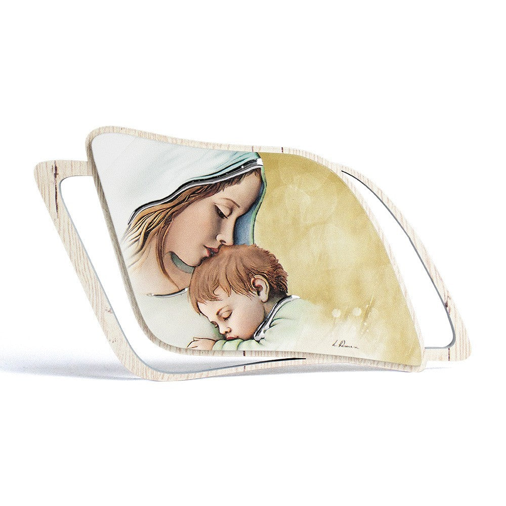 Esta imagen de la Maternidad de la Virgen María, creación del artista italiano Luigi Pesareti, es realizada en una nueva tecnología de madera llamada MDF, enriquecida con fibras sintéticas que proporcionan una combinación de ligereza y resistencia. La imagen es finamente pintada y enriquecida con inserciones de plata laminada. La imagen se puede utilizar en una mesa o superficie con el soporte de acero incluido, o se puede colocar en la pared. Incluye su caja con certificado de autenticidad y de fabricación 100% italiana.