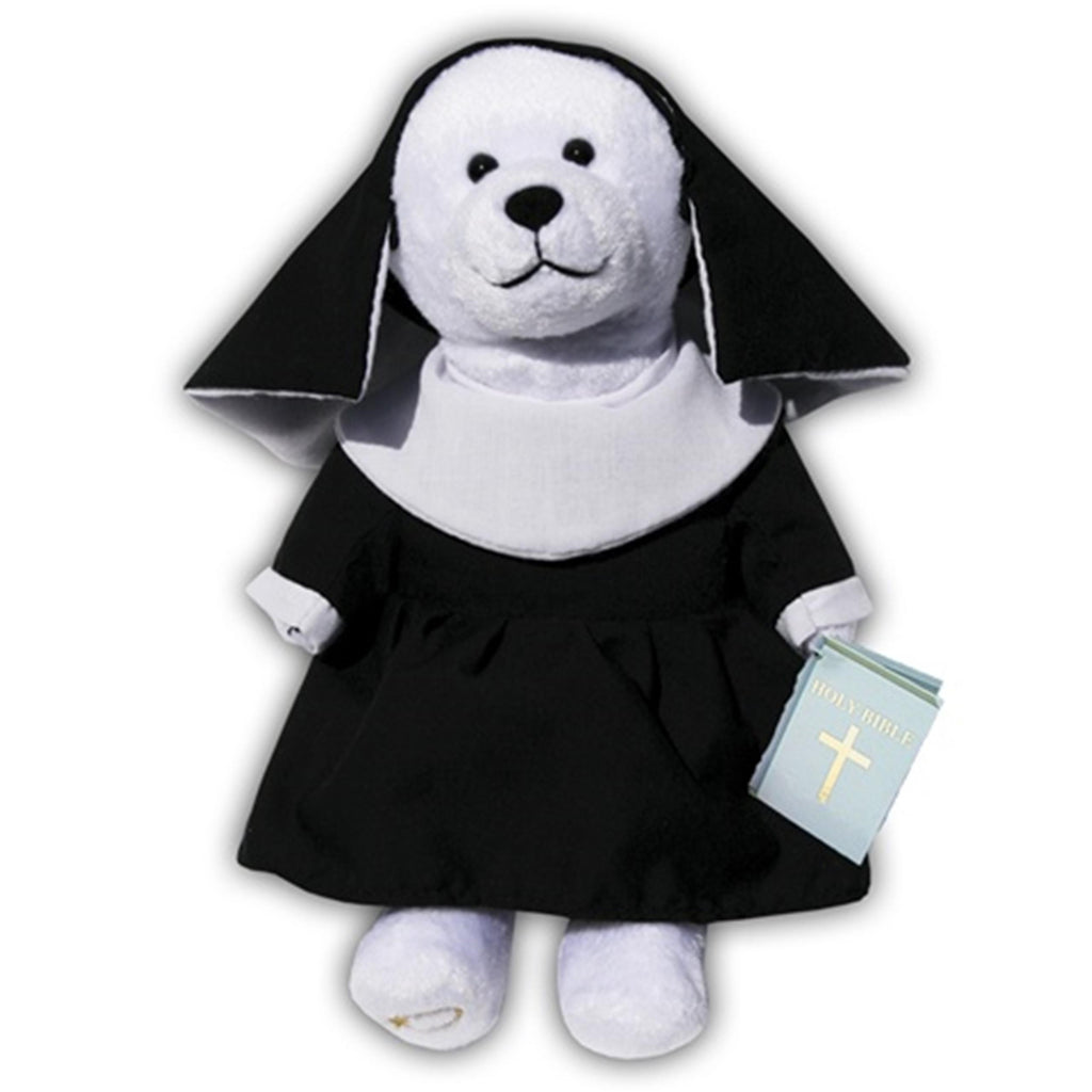El peluche Monjita cuenta con su hábito vocacional completo. Incluye una pequeña tarjeta en forma de la Biblia con una petición de oración por las vocaciones y la cita bíblica de Mateo 9, 36-38. Apropiado para edades de 3 en adelante. Dimensiones: 10.25" x 5.75".