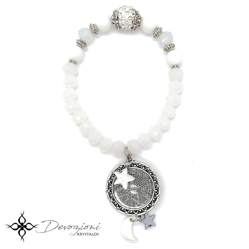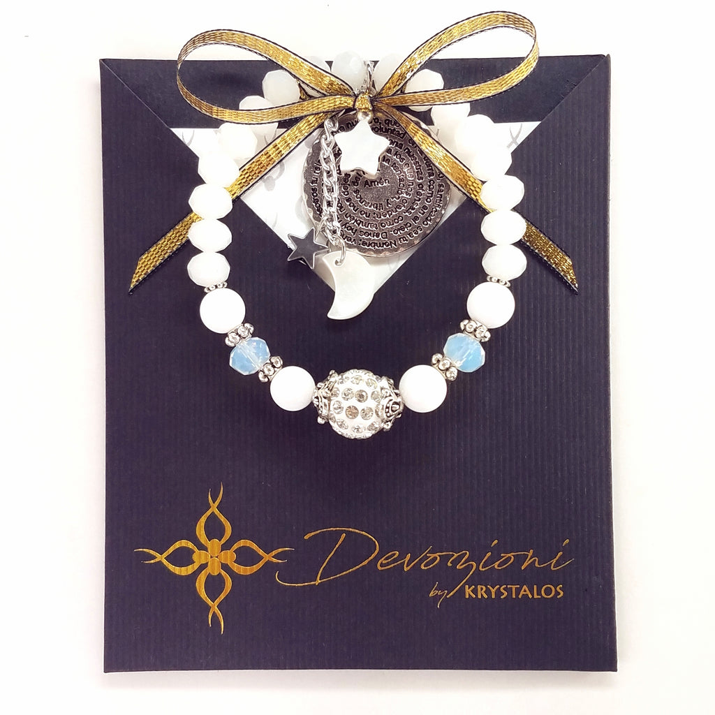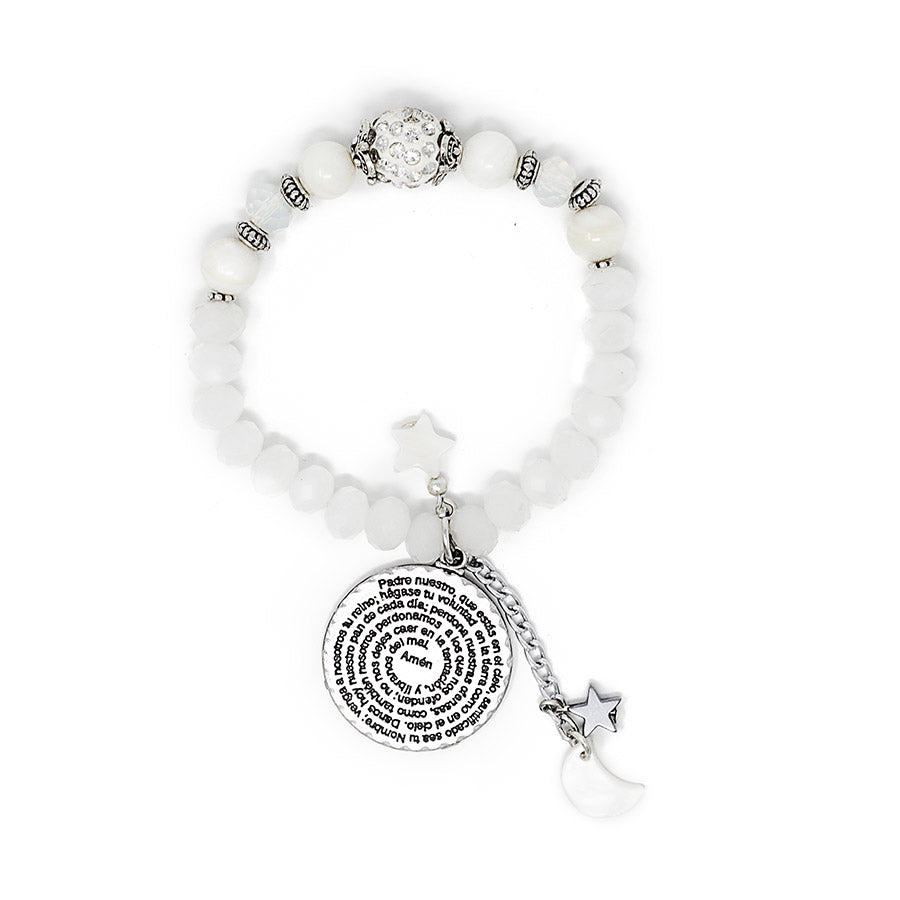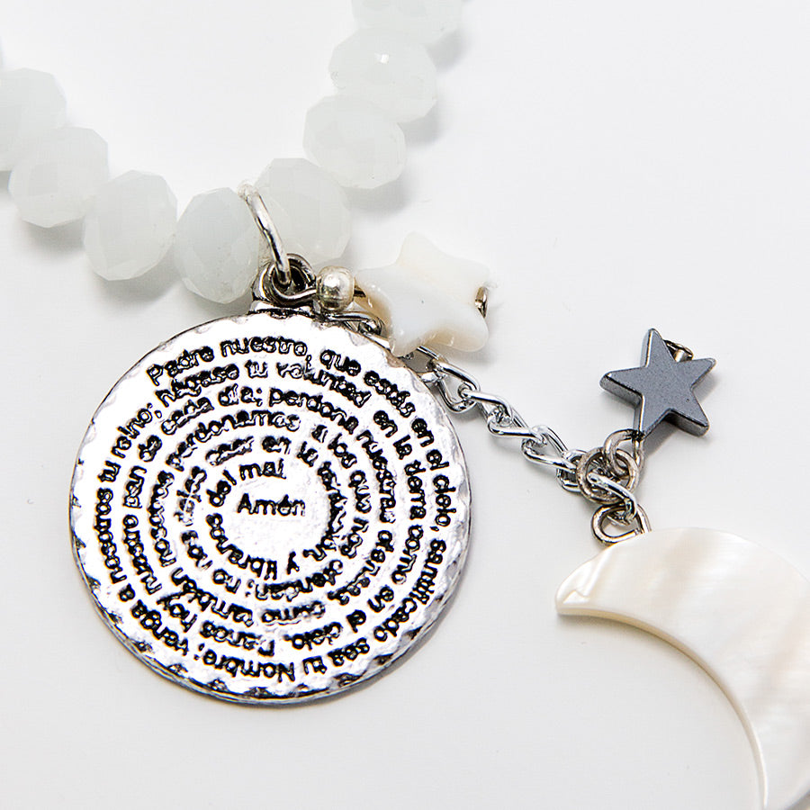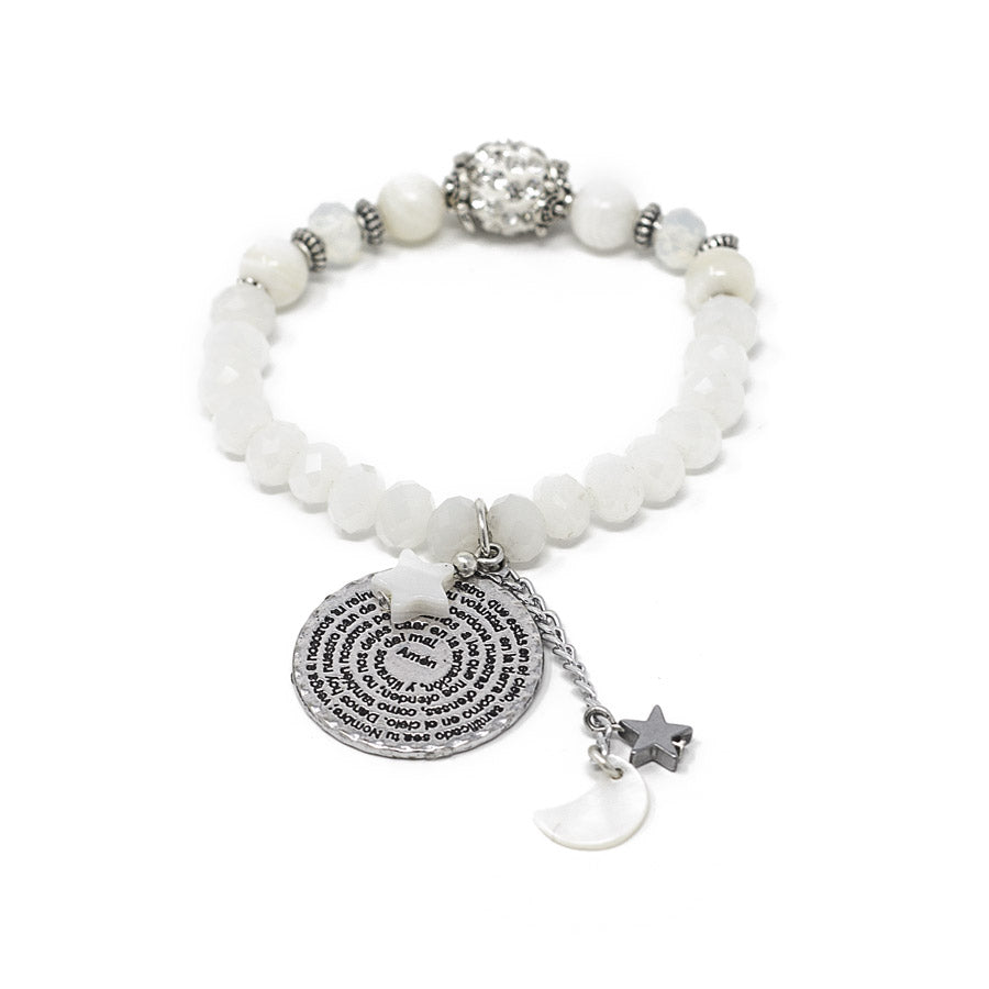 Este hermoso brazalete está hecho en madreperlas genuinas y cristales facetados, con la medalla de la Oración del Padre Nuestro y colgantes en Hematitas y Shell. Tarjeta de oración de regalo incluída. ¡Buenas noches!