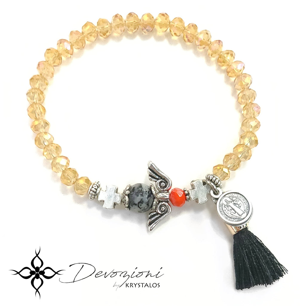 Este brazalete inspirado en el "Komboskini" o "cuerda de oración" cuenta con 33 cristales facetados que nos recuerdan los 33 años de Jesucristo en la tierra. La cruz (representada en la cruz "Vade Retro Satana" de San Benito de la medalla) nos recuerda a Jesús y su sacrificio. El ángel nos recuerda que Dios no nos abandona, y siempre nos cuida por medio de nuestro Ángel de la Guarda (los nudos originales del Komboskini se llamaban "nudos angelicales"). Y la borla nos recuerda que el Señor es el consuelo a nuestras lágrimas.