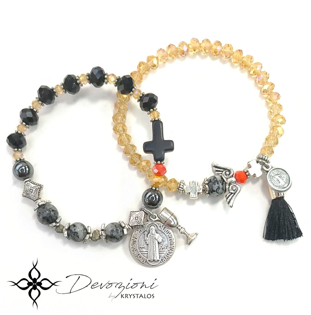 El estilo y los colores complementan el brazalete Rosario histórico de San Benito, por lo cual incluye como colgante la medalla mini de la Cruz de San Benito.