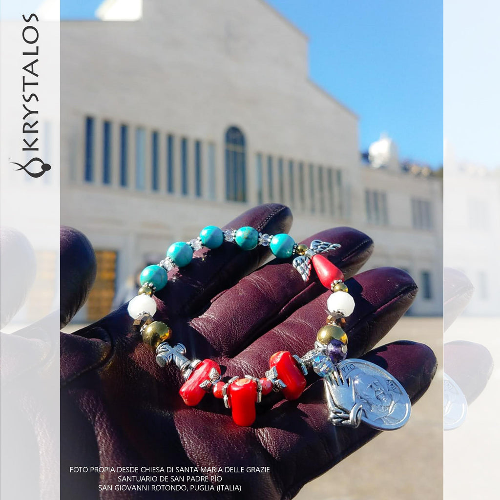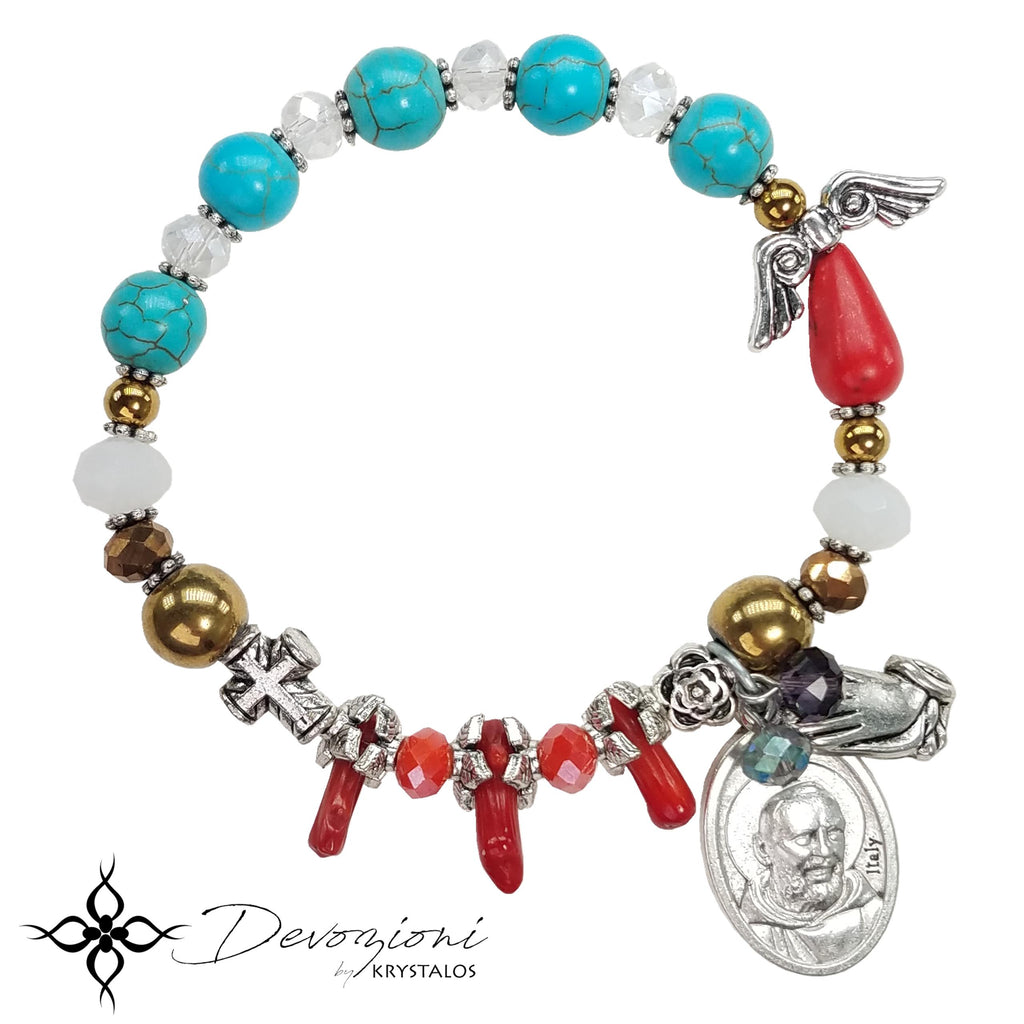 Brazalete Rosario en cristales facetados, corales, hematitas y howlitas teñidas. Metales esmaltados y medalla religiosa original italiana. Cada elemento de este brazalete alude a simbolismos y hechos importantes de la vida de San Padre Pío de Pietrelcina. Folleto explicativo a color incluído.