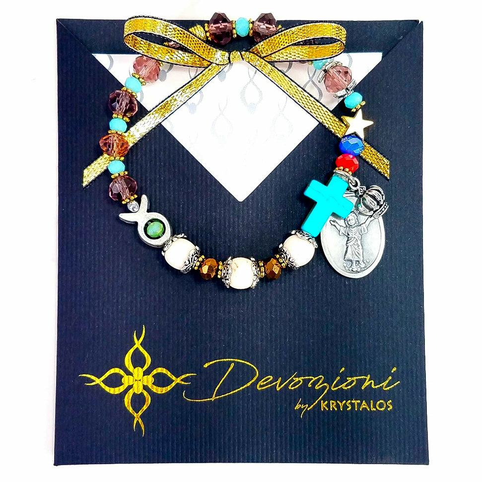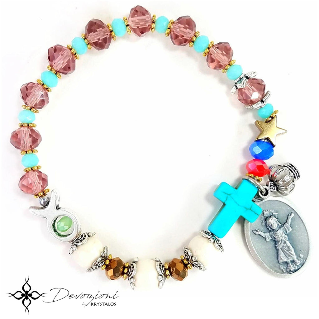Brazalete rosario en cristales facetados y piedras semi-preciosas genuinas como howlitas teñidas y hematitas. Metales esmaltados y medalla auténtica italiana del Divino Niño. Cada elemento de este brazalete alude a simbolismos y hechos importantes sobre la historia de la devoción del Divino Niño. Folleto explicativo a color incluído.