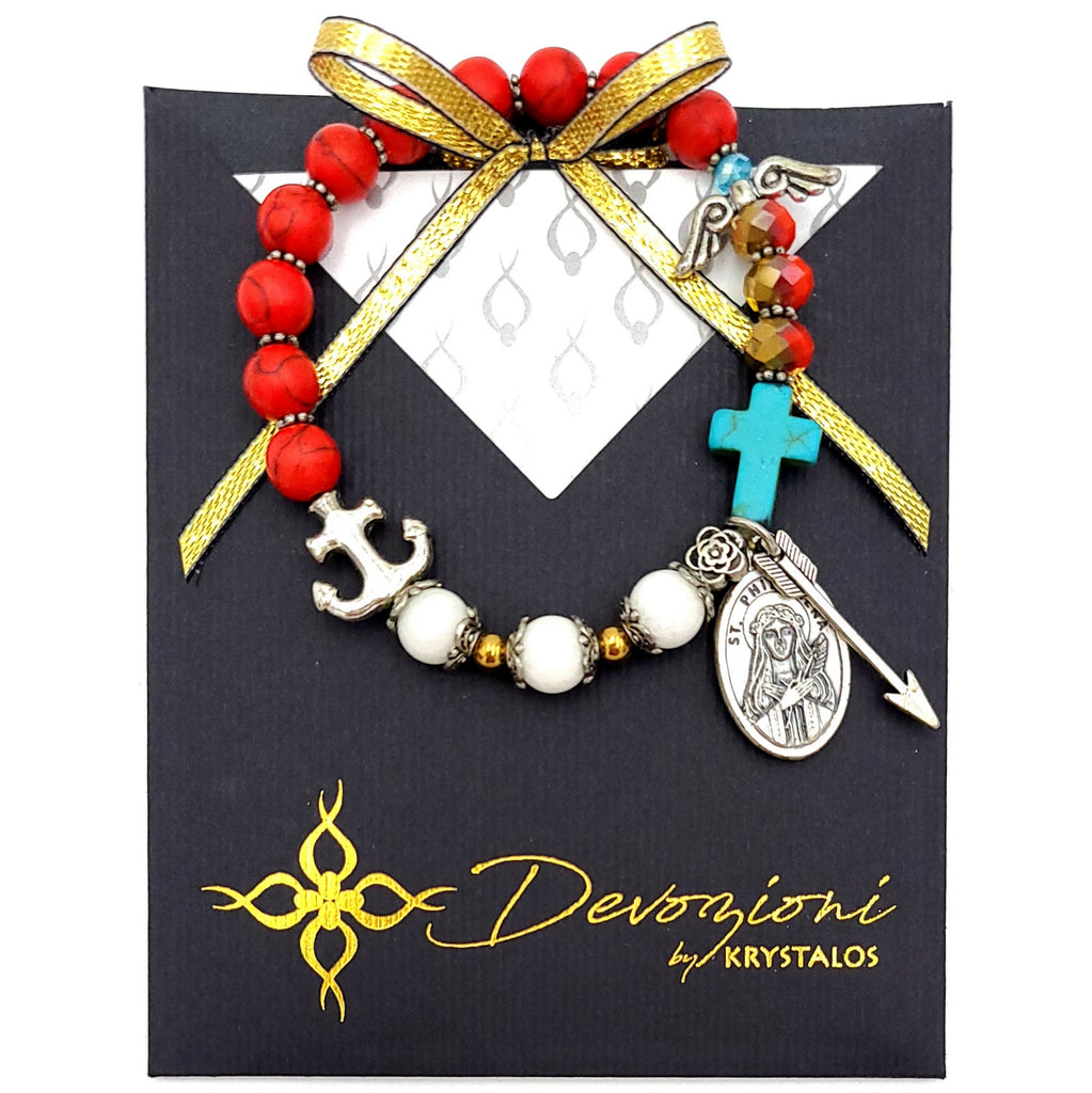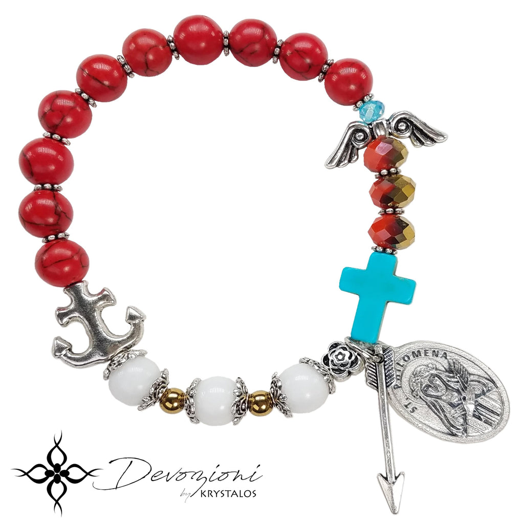 Consta principalmente de 13 cuentas rojas (10 howlitas y 3 cristales) que simbolizan su martirio, 3 jades blancos, simbolizando su virginidad… e incluye el “twist” único de Devozioni by Krystalos en piedras como cristales facetados, hematitas, etc., que te cuenta su milagrosa historia. Incluye también metales esmaltados y medalla original italiana de Santa Filomena con San Juan María Vianney al dorso, quien fue el autor de las letanías a esta gran santa. Explicativo histórico incluído.