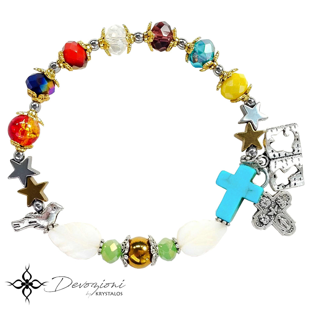 Este brazalete contiene la Coronilla del Espíritu Santo en los colores representativos de cada uno de sus Dones, y medalla original italiana del Espíritu Santo. Hecho en hematitas, cristales facetados, madreperla, glass teñido y metales esmaltados. Folleto explicativo a color incluído.