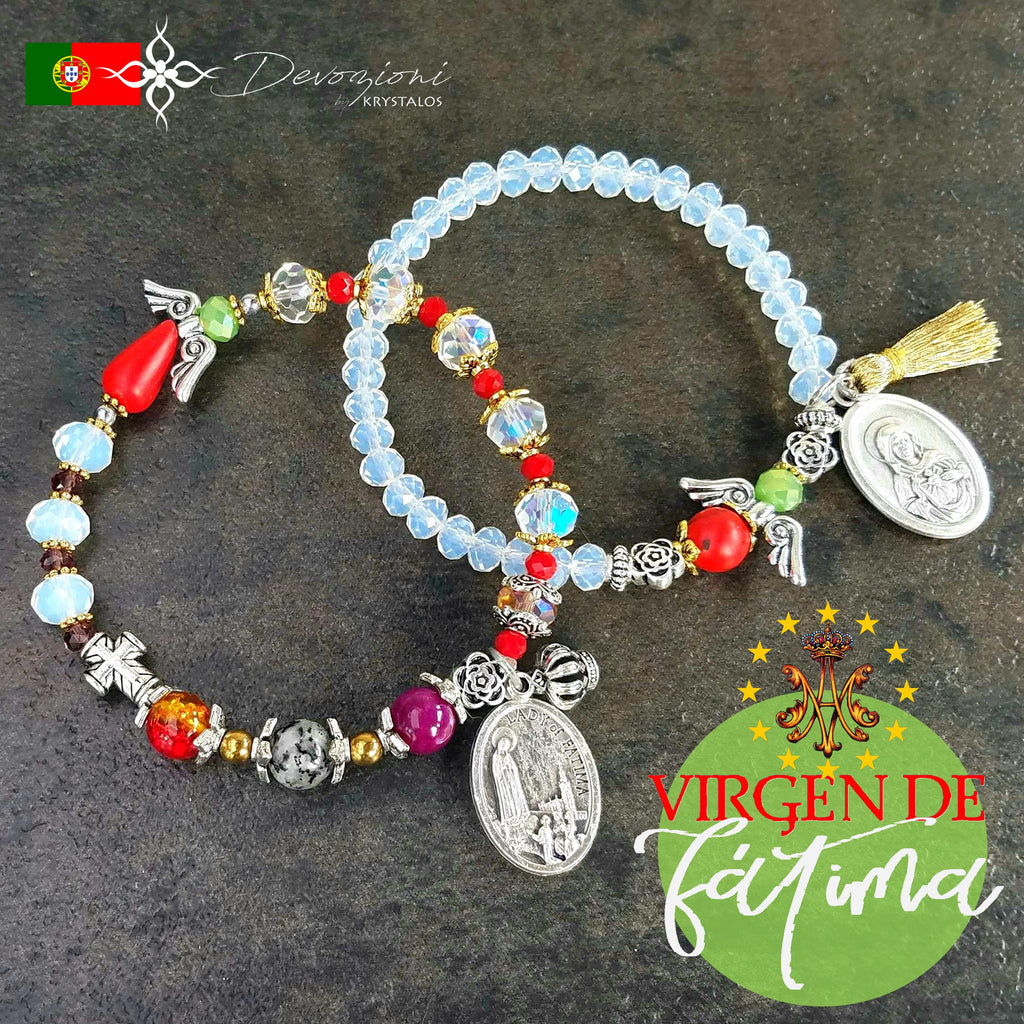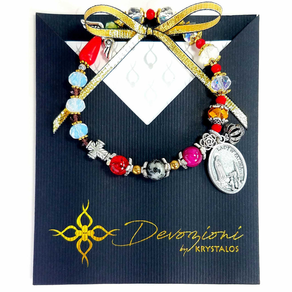 Brazalete rosario en cristales facetados y piedras semi-preciosas genuinas como howlitas teñidas, “sesame jaspers”, “riverstone”, hematitas y cristales facetados. Metales esmaltados y medalla auténtica italiana de la Virgen de Fátima. Cada elemento de este brazalete alude a simbolismos y hechos importantes sobre la historia de la devoción de la Virgen de Fátima y sus 3 Grandes Secretos. También incluye la historia de la devoción de los 5 Primeros Sábados de Reparación al Inmaculado Corazón de María, según ilustrada a Sor Lucía por la Virgen en sus visiones posteriores en Pontevedra, y marcadores guías para seguirla. Folleto explicativo a color incluído.