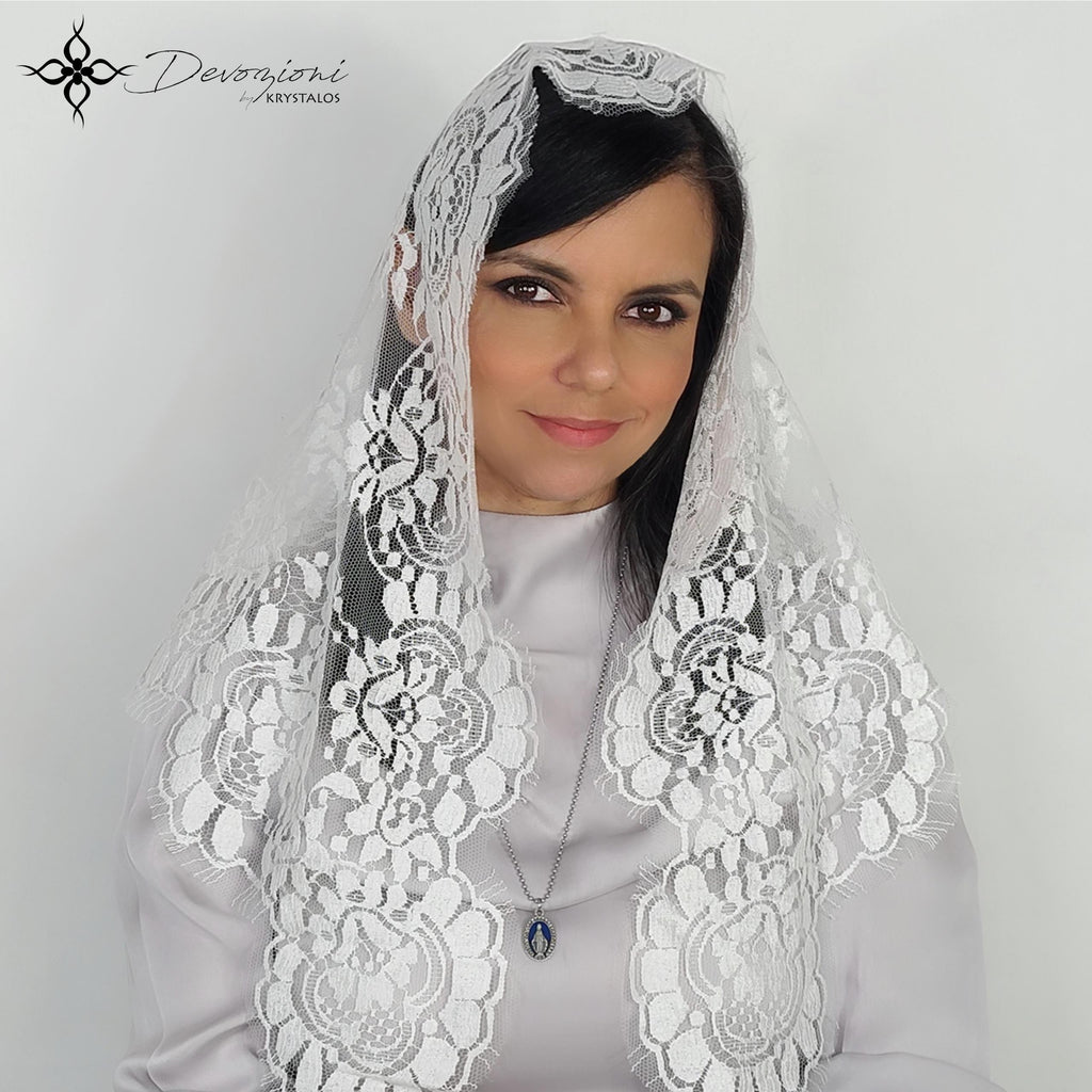 Mantilla de Misa genuina de España con diseños bordados floreados, hecha en el legendario y fino encaje “leavers” español. Al ser este encaje uno protegido por la Comisión Europea, la mantilla incluye certificación de autenticidad de dicha entidad.