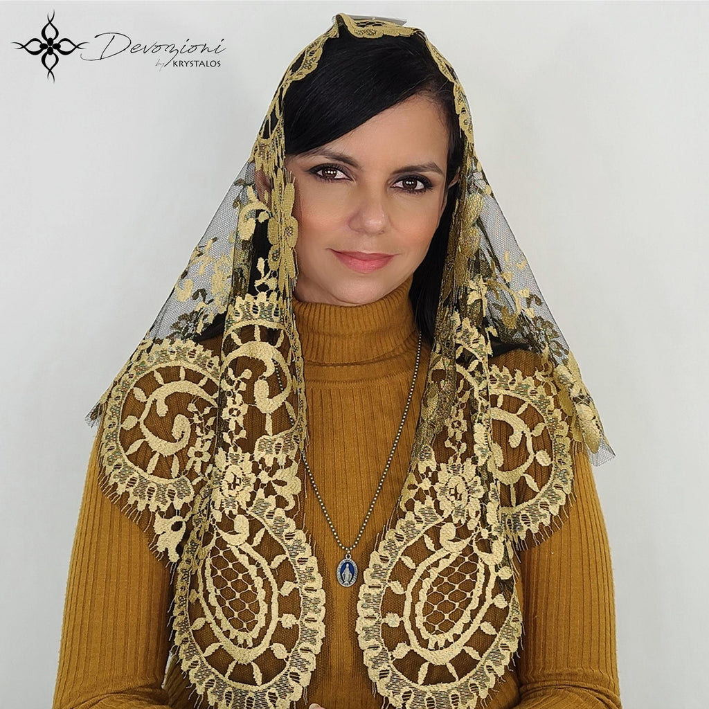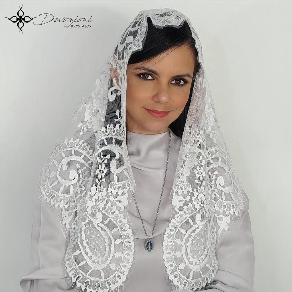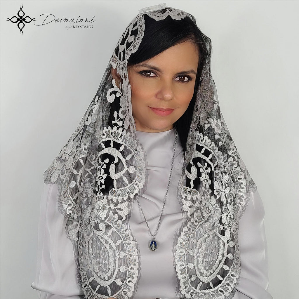Mantilla de Misa genuina de España con diseños bordados en medallones, hecha en el legendario y fino encaje “leavers” español. Al ser este encaje uno protegido por la Comisión Europea, la mantilla incluye certificación de autenticidad de dicha entidad.