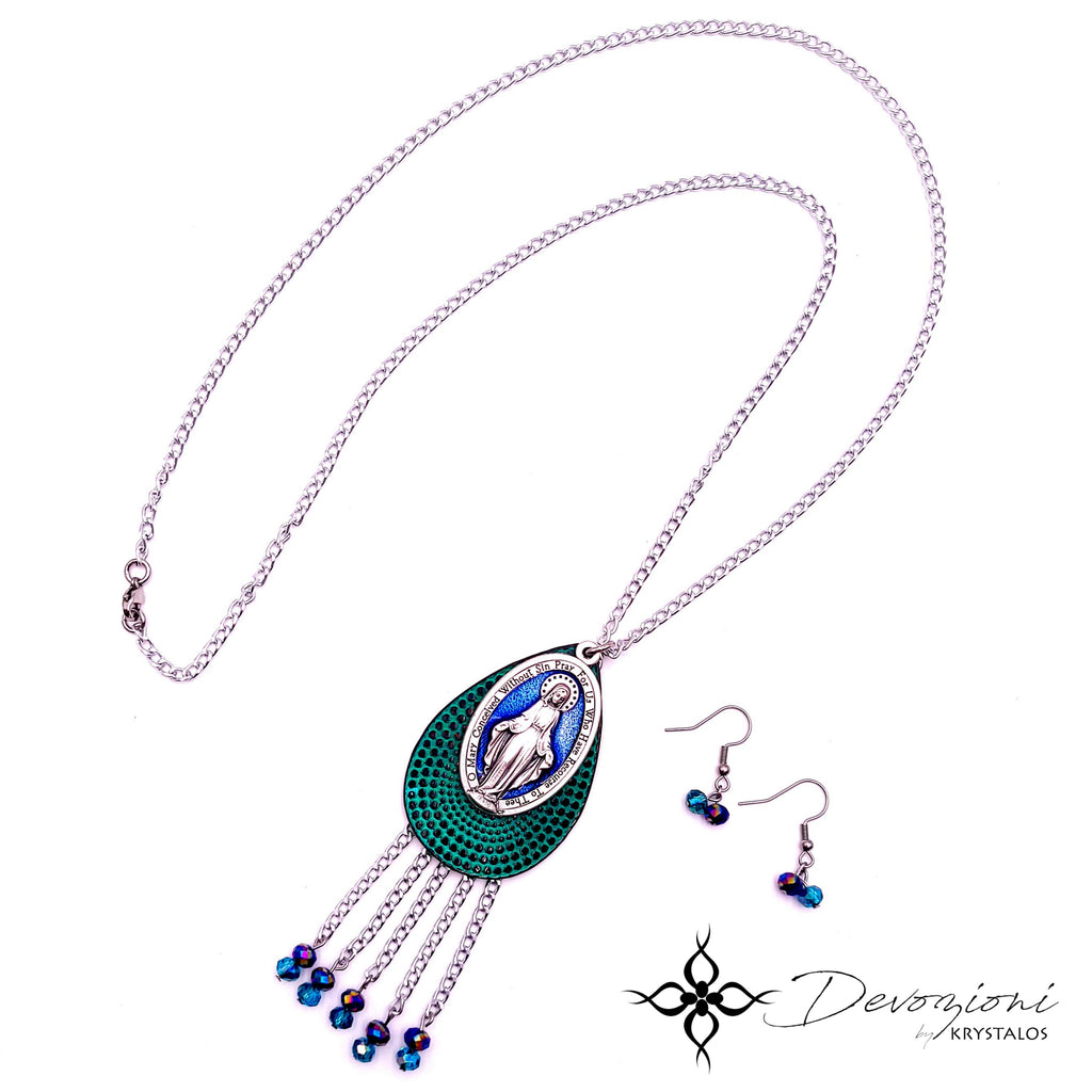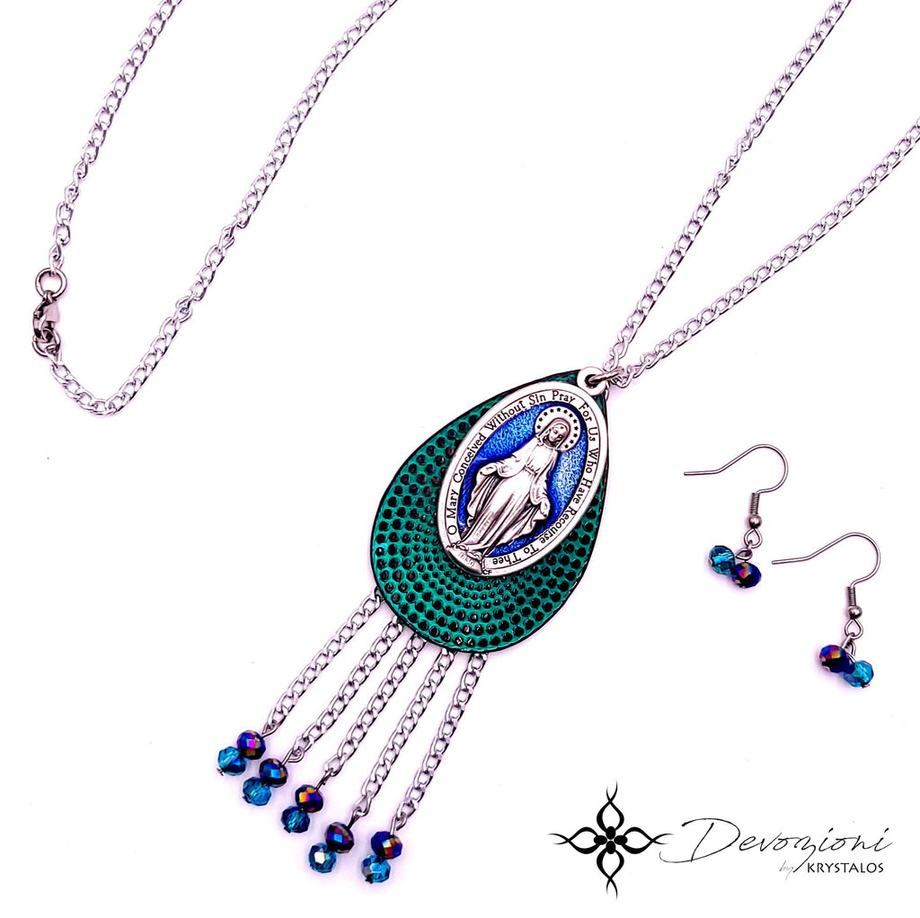 Lleva tu rezo del Rosario junto a ti con este set de collar decenario en enganches y cierres en Stainless Steel y cadenas de aluminio, con la Medalla Milagrosa esmaltada en tamaño gigante. La Medalla Milagrosa solamente mide... ¡casi 2" de largo!... es original italiana y cuenta con 10 cristales facetados para contar los rezos del Rosario. El colgante de gota simboliza las lágrimas de María por su Hijo y por el mundo. Cadena de aluminio de 30" que no cambia de color. Largo total aproximado de colgante: 5.5”. Aretes en Stainless Steel y cristales facetados.