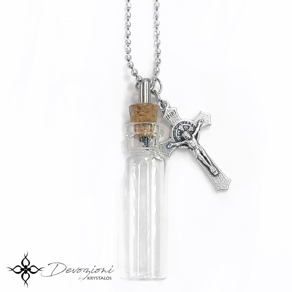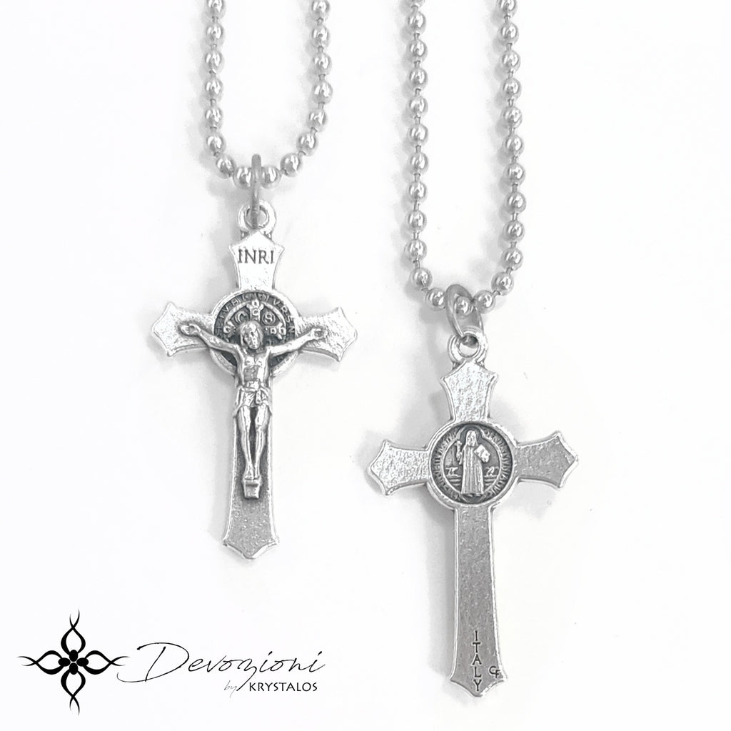 Crucifijo de 1.5" de largo con medalla de la Cruz de San Benito al frente y al dorso en 100% ZAMAC, en una cadena de aluminio tipo "ball chain" de 24" de largo y "ball diameter" de 3/32″. Puedes elegir entre el collar sencillo y el collar con botellita para Agua Bendita.