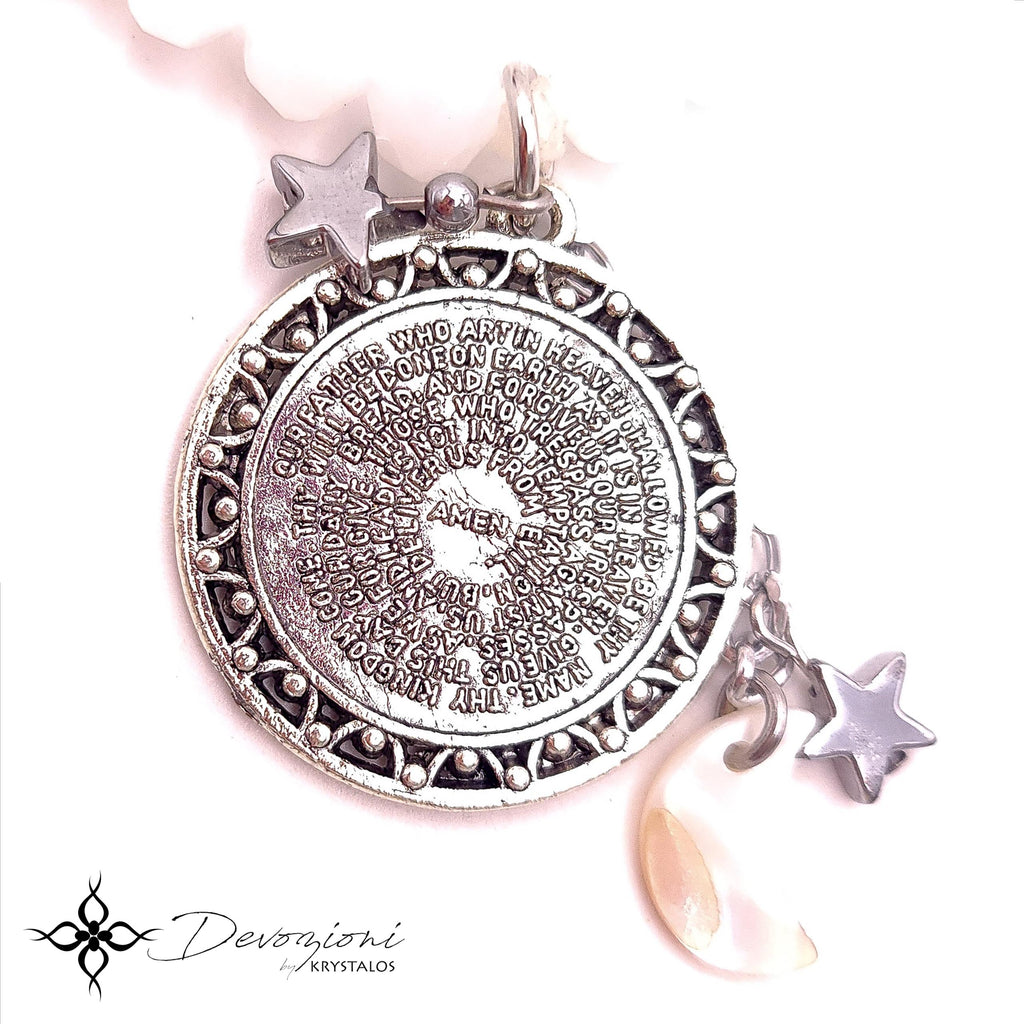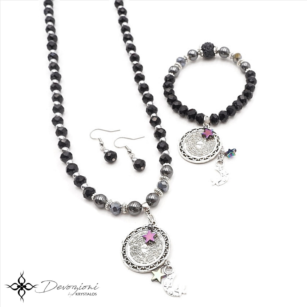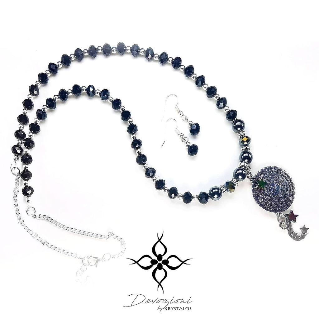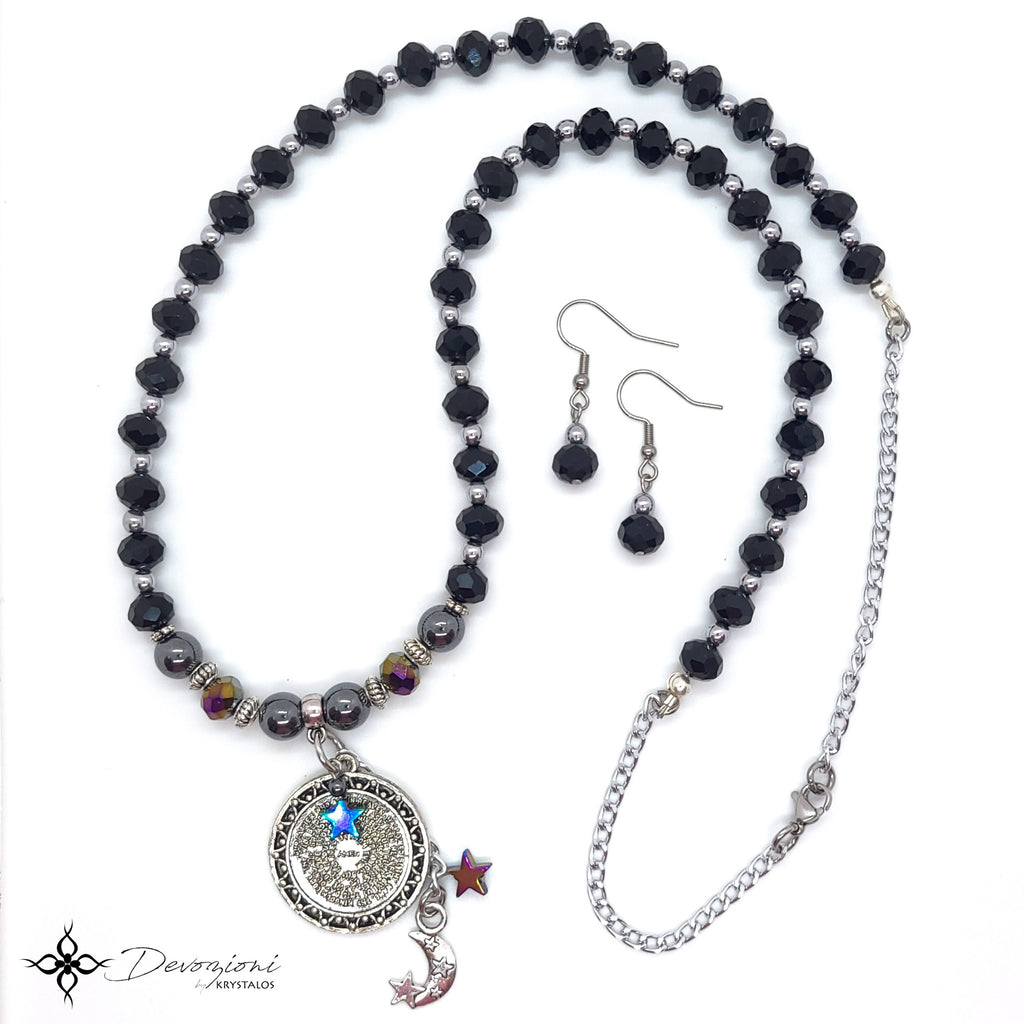 Este hermoso set de collar y aretes está hecho en hematitas genuinas y cristales facetados, con la medalla de la Oración del Padre Nuestro esmaltada y colgantes en Hematitas. Interior del collar en alambre de "Stainless Steel" (acero inoxidable). Cierres, ganchos de aretes y terminaciones en "Stainless Steel" (acero inoxidable). ¡Buenas noches!