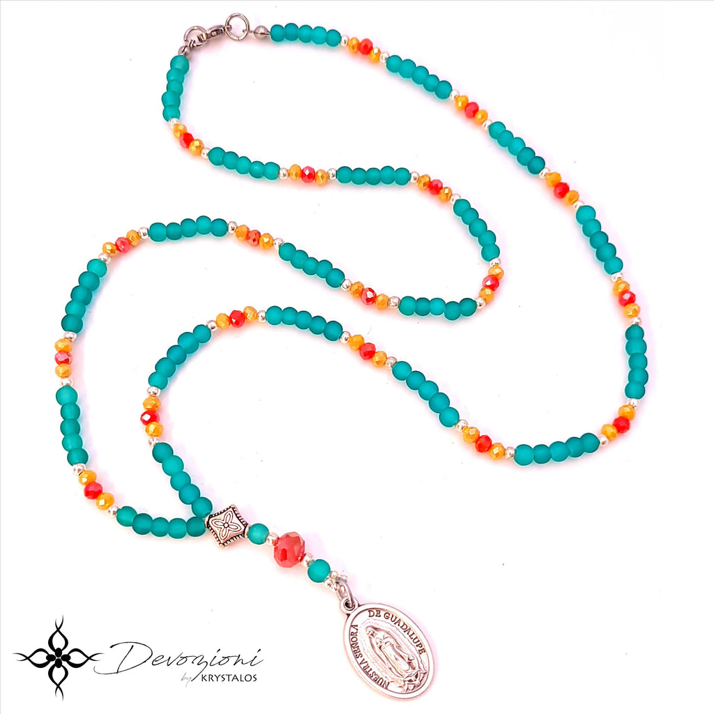 Collar medallero en cristales facetados y "glass" ahumado. Metales esmaltados y medalla original italiana de la Virgen de Guadalupe. Circumferencia aproximada: 30".