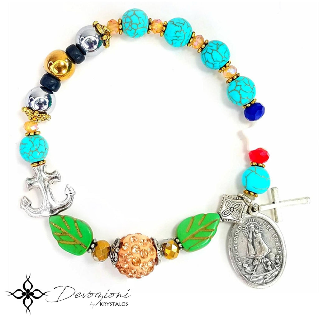 Brazalete Rosario en cristales facetados y piedras semi-preciosas genuinas como howlitas teñidas, madreperla, hematitas y madera. Metales esmaltados y medalla auténtica italiana de la Virgen de la Caridad del Cobre. Cada elemento de este brazalete alude a simbolismos y hechos importantes sobre la historia de la devoción de la Virgen de la Caridad del Cobre, Patrona de Cuba (folleto explicativo incluído).