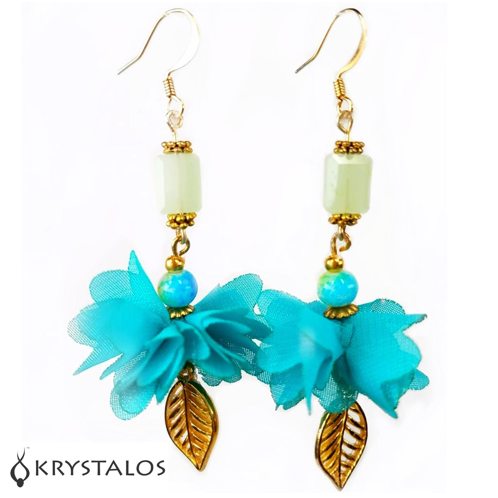 Aretes en cristales facetados rectangulares y ovalados, con colgante en forma de "angel de las flores" con glass teñido y hoja dorada. Ganchos enchapados en oro 18K.