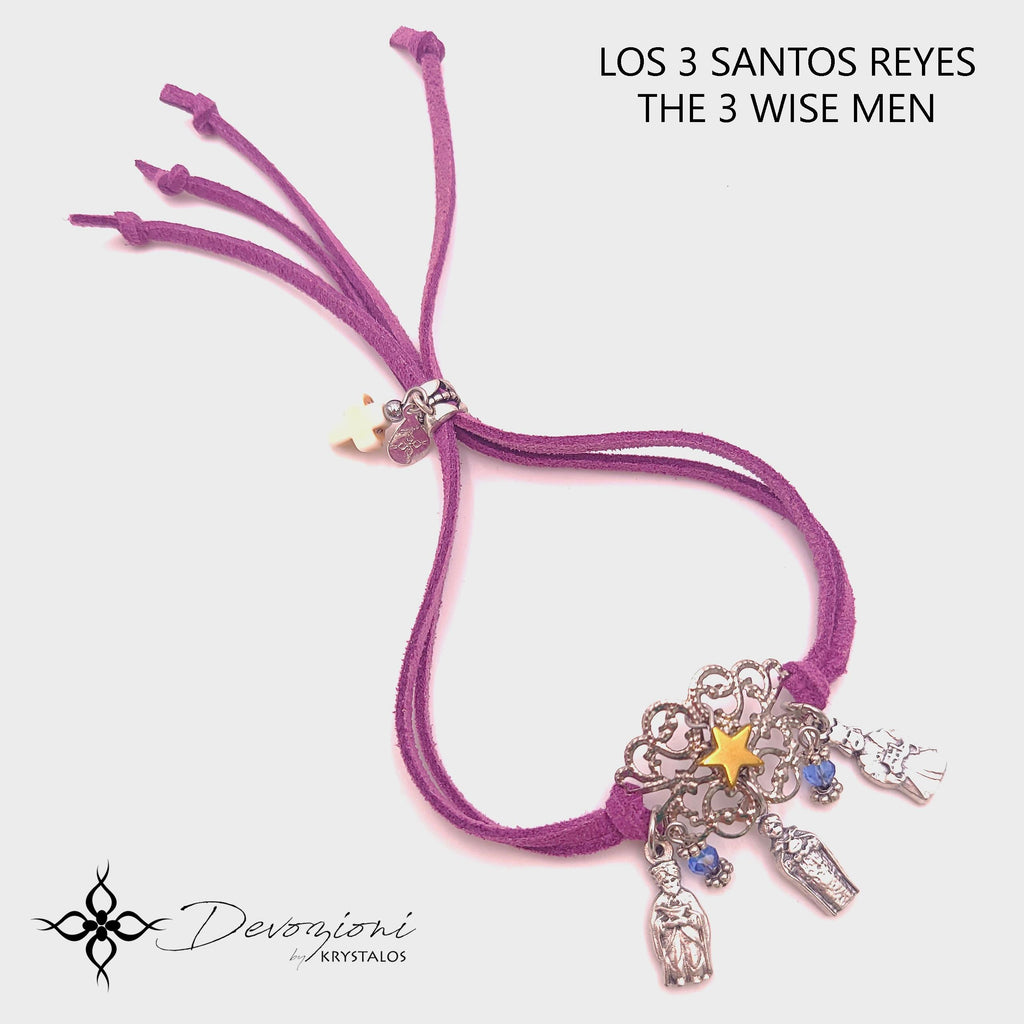Estos brazaletes medalleros en gamuza ("suede") nos recuerdan la esencia de la temporada de Adviento y Navidad en 3 estampas de distintos personajes propios de la temporada. Ellos cuentan con una hermosa mezcla de cristales facetados, hematitas y howlita teñida, junto con una combinación de elementos metálicos en acero inoxidable ("Stainless Steel") y metales esmaltados.
