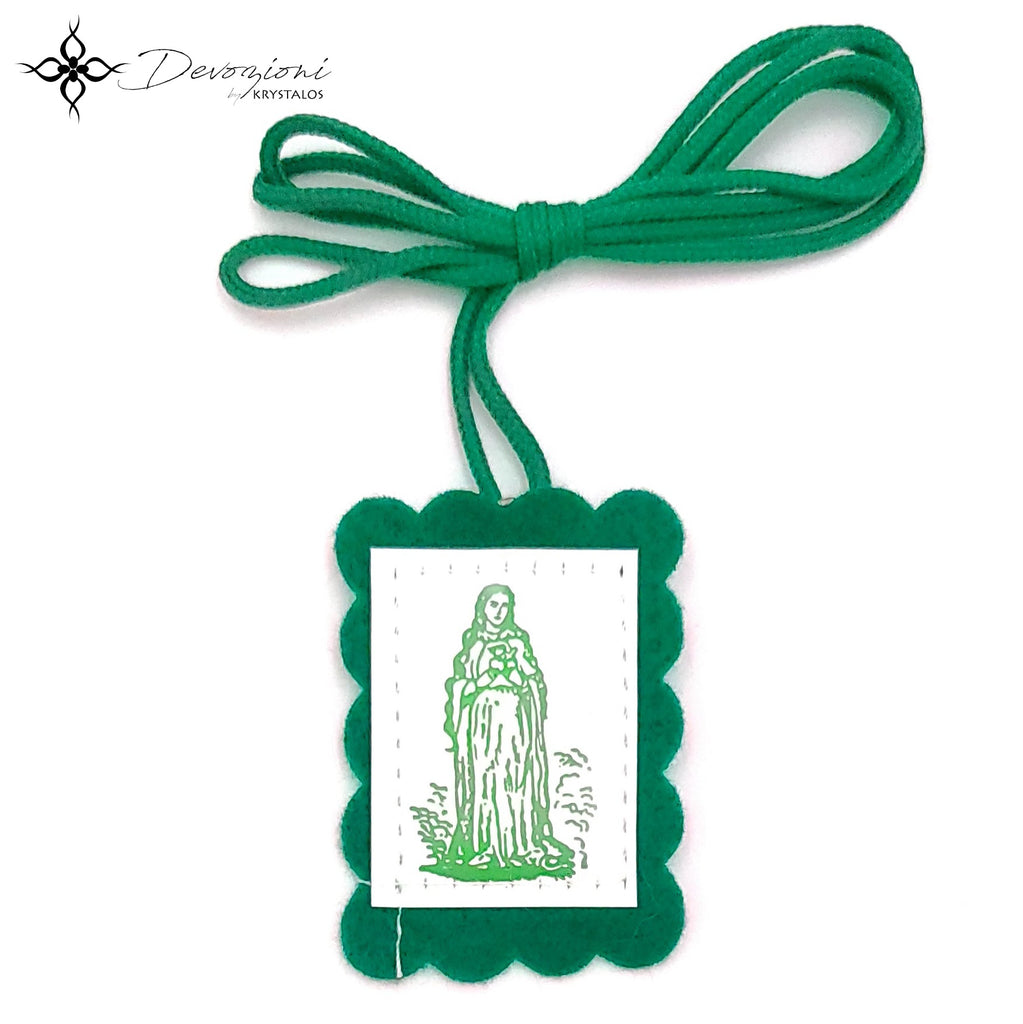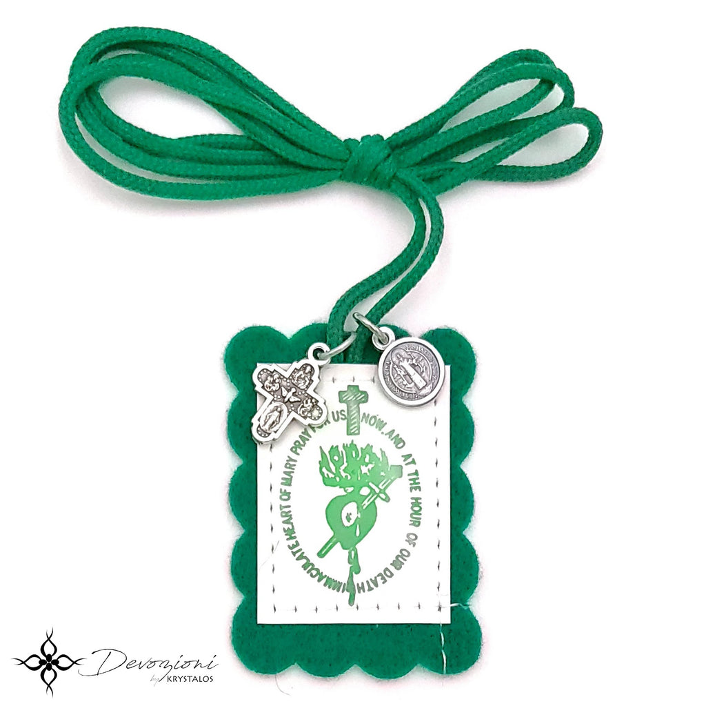 Este Escapulario Verde consta de una escápula de 2.125" x 1.5". Por un lado tiene la imagen de Nuestra Señora apuntando hacia su Inmaculado Corazón, y por el otro tiene la imagen del Inmaculado Corazón de María con la oración: "Inmaculado Corazón de María, ruega por nosotros ahora y en la hora de nuestra muerte." El Escapulario tiene también las medallas originales italianas de la Cruz de las 5 Vías y la Cruz de San Benito. Incluye panfleto educativo.