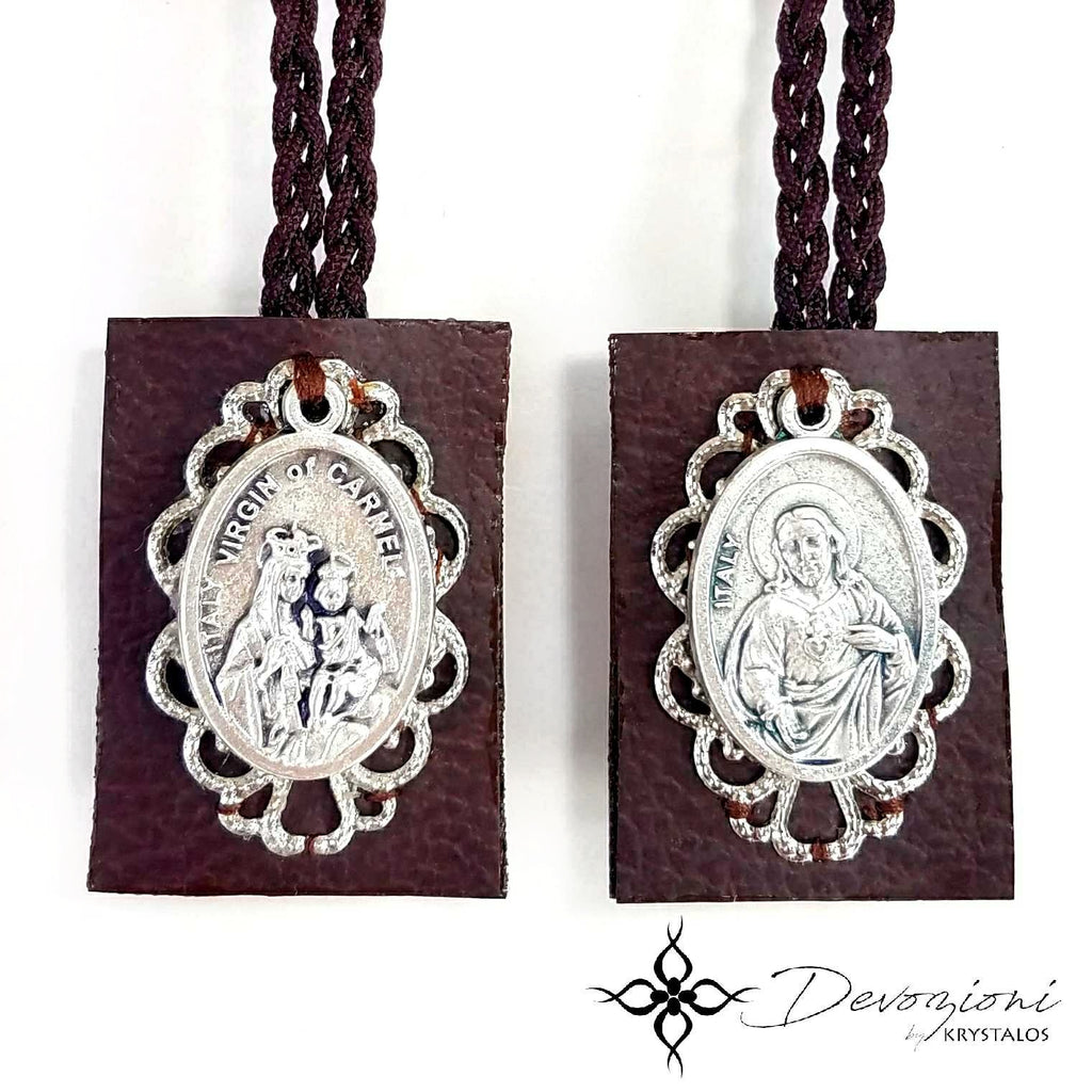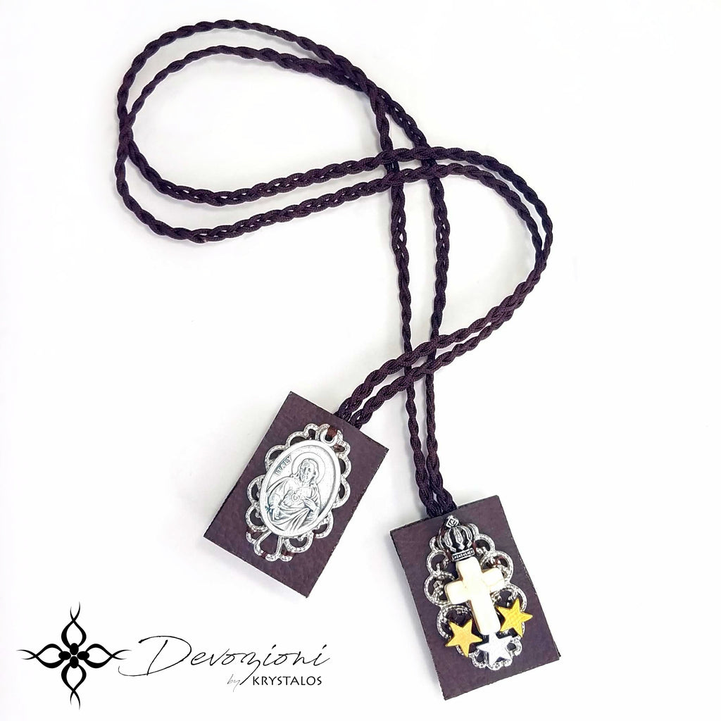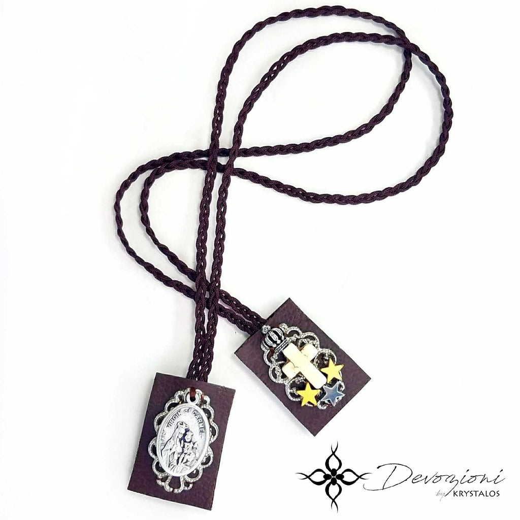 Esta delicada y fina versión del Escapulario de la Virgen del Carmen consta de escápulas de 1.5" x 1" en vinyl, unidas por doble cordón trenzado a mano de 15" de largo en nilón grueso. Cada escápula consta de 2 lados: un lado tiene la representación del Escudo Carmelita bordado a mano en piedras semipreciosas como cruces en howlitas y estrellas en hematitas, todas genuinas. Al otro lado tiene las medallas originales italianas de la Virgen del Carmen y el Sagrado Corazón de Jesús sobre un filigrana esmaltado. El Escapulario viene envuelto en un fino saco de organza.