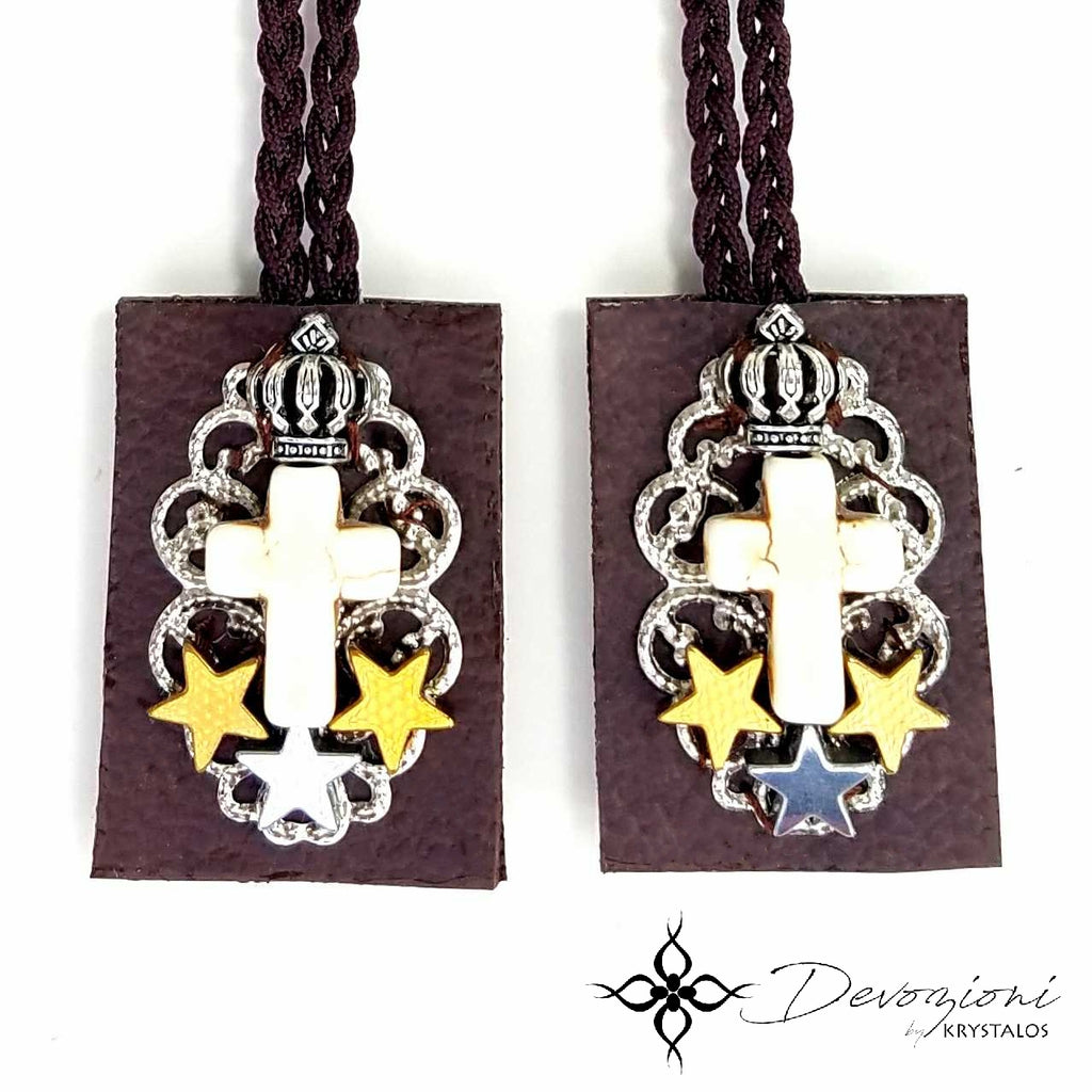Esta delicada y fina versión del Escapulario de la Virgen del Carmen consta de escápulas de 1.5" x 1" en vinyl, unidas por doble cordón trenzado a mano de 15" de largo en nilón grueso. Cada escápula consta de 2 lados: un lado tiene la representación del Escudo Carmelita bordado a mano en piedras semipreciosas como cruces en howlitas y estrellas en hematitas, todas genuinas. Al otro lado tiene las medallas originales italianas de la Virgen del Carmen y el Sagrado Corazón de Jesús sobre un filigrana esmaltado. El Escapulario viene envuelto en un fino saco de organza.