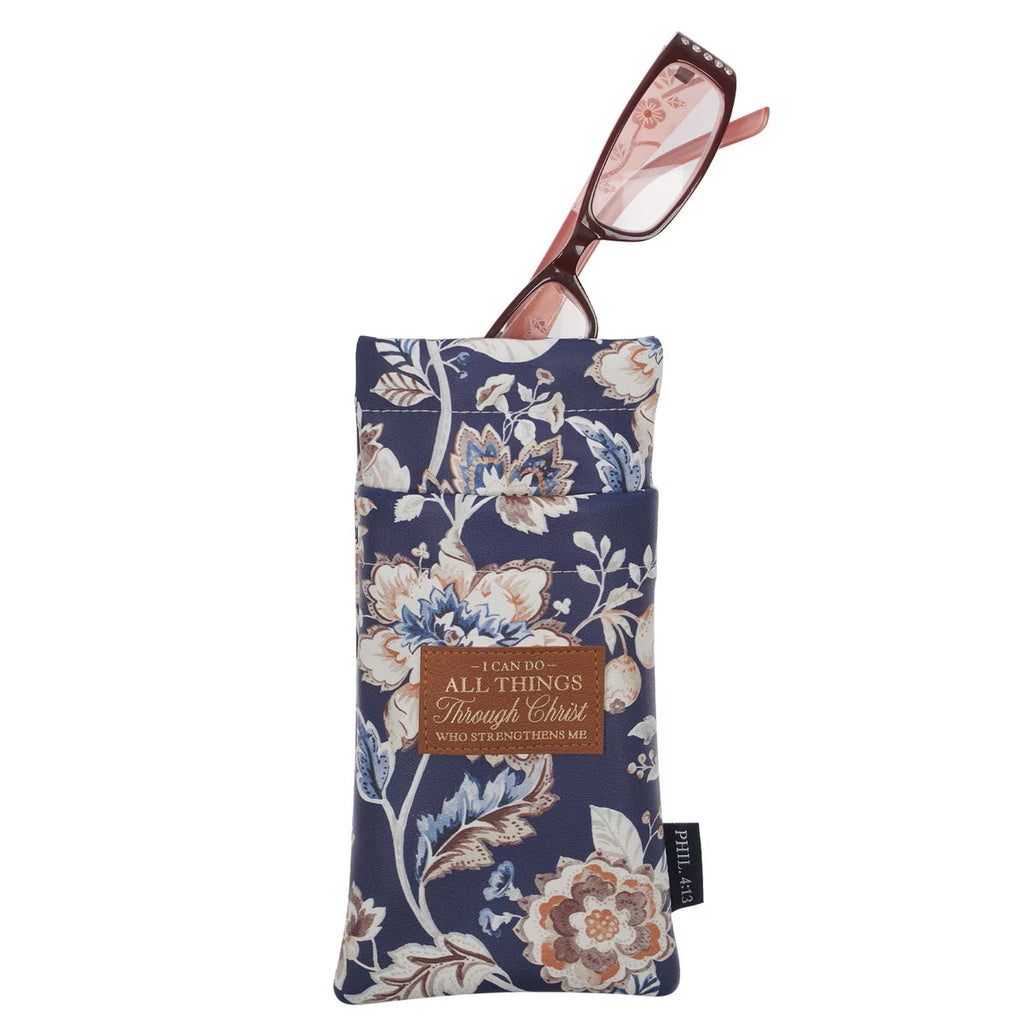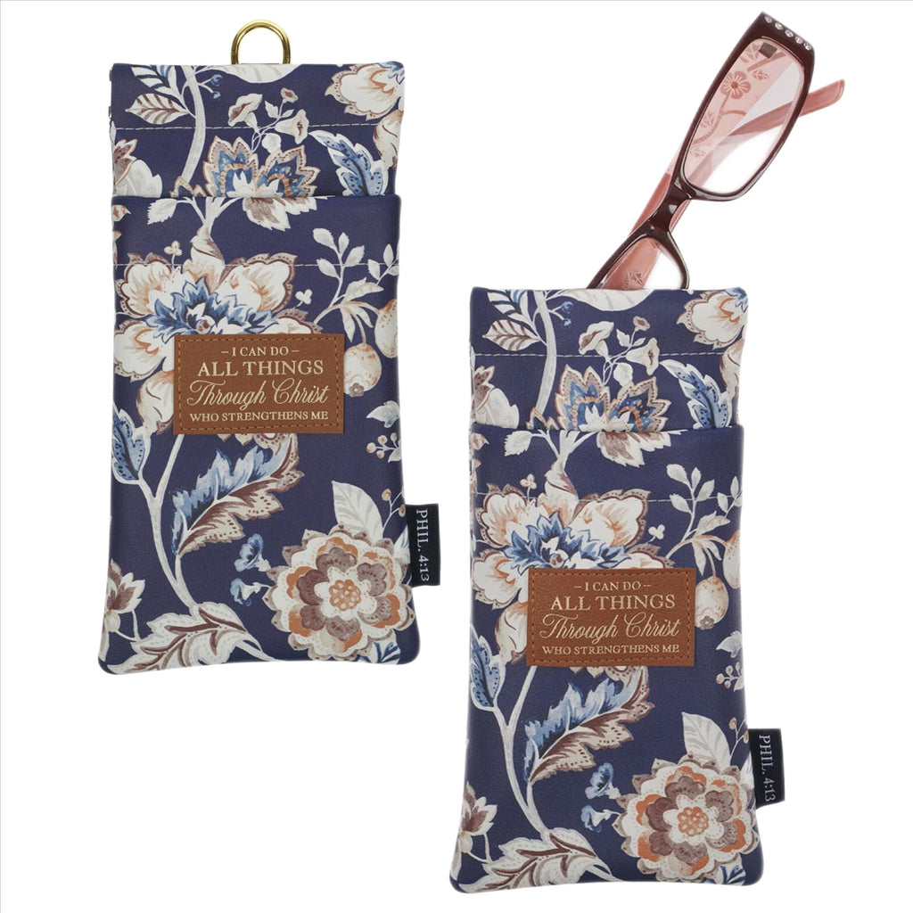 El estuche doble para anteojos azul viene con el versículo bíblico: “Todo lo puedo en Cristo que me fortalece” (Filipenses 4, 13)