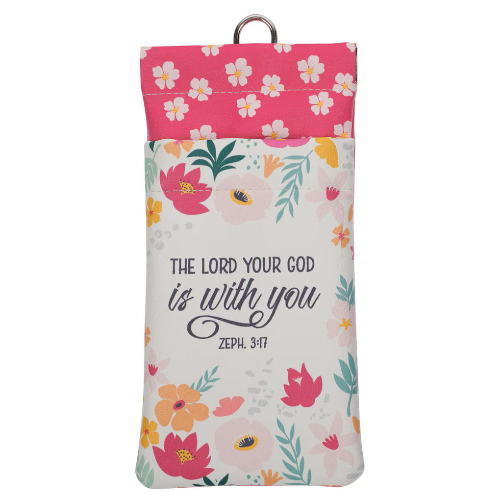 El estuche doble para anteojos rosa fuerte viene con el versículo bíblico: “El Señor, Tu Dios, está en medio de ti” (Sofonías 3, 17)