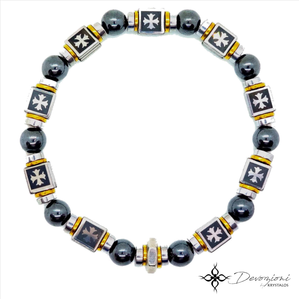Brazalete expandible para caballeros en hematitas negras, doradas y plateadas, y detalle de tuerca en "stainless steel". Circunferencia aproximada en reposo: 8", expandible a aproximadamente 8.5".