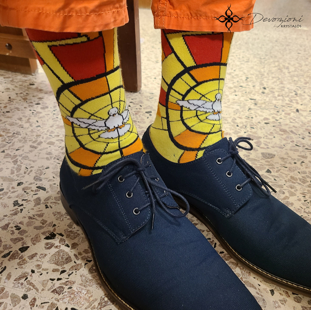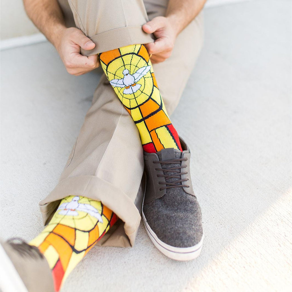 Inspirados en el vitral en la parte posterior de la Basílica de San Pedro en la Ciudad del Vaticano, estos calcetines te recordarán el corazón de nuestra Iglesia, la Santísima Trinidad, y la audacia que podemos recibir del Espíritu Santo para compartir a diario la alegría de ser parte del Pueblo de Dios.