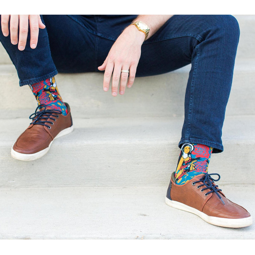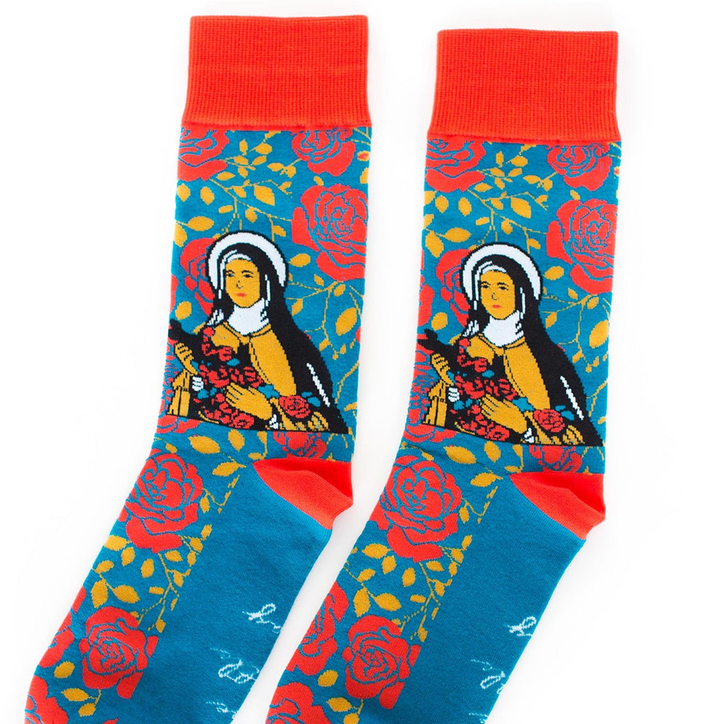 Estos calcetines unisex conmemoran a Santa Teresita del Niño Jesús, la patrona de los misioneros y quien nos enseñó que en las pequeñas cosas que se hacen día a día con amor, se encuentra el camino hacia Dios. Los calcetines tienen la imagen tejida de Santa Teresita del Niño Jesús en ambos lados. Y en la planta del calcetín encontrarás la frase "El Caminito", como ella misma nombró su camino espiritual hacia la santidad.