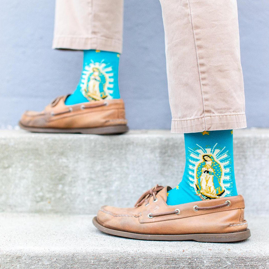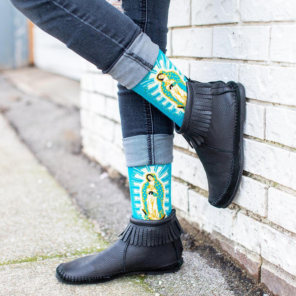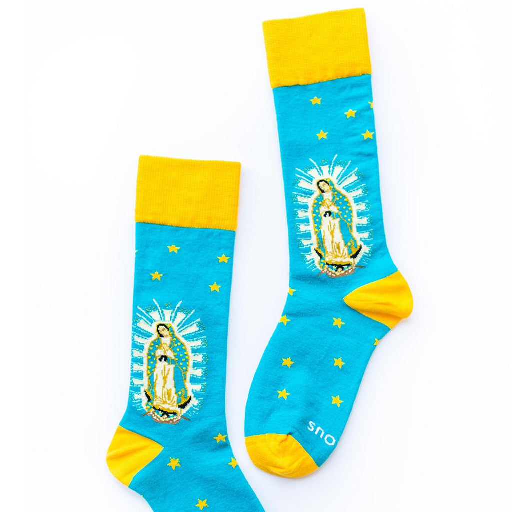 Estos calcetines unisex conmemoran a la Virgen de Guadalupe, la Emperatriz de América. Tiene la imagen tejida de la Virgen de Guadalupe en ambos lados, y está llena de las hermosas estrellas de su manto.