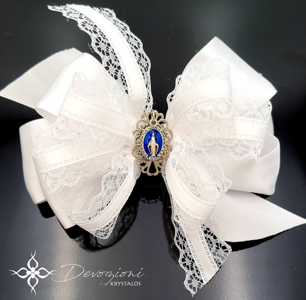 Lazo para niña en una delicada combinación de cinta de tela satinada y cinta en puntilla. Medalla devocional italiana genuina con motivo de la Virgen María en esmalte azul royal, sobre filigrana metálico doble esmaltado. Pinche de enganche al dorso. Dimensiones aproximadas: ancho: 5.375", largo 7" (del extremo del pico superior al extremo del pico inferior).