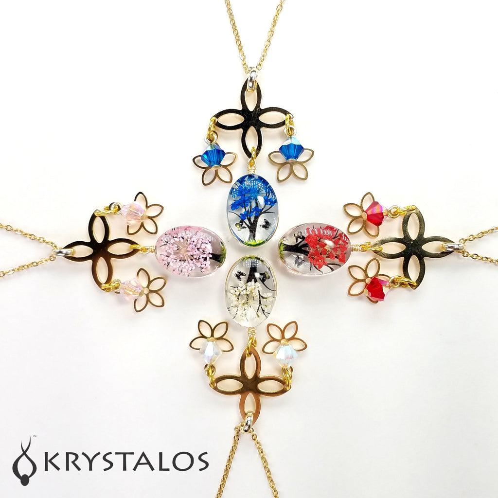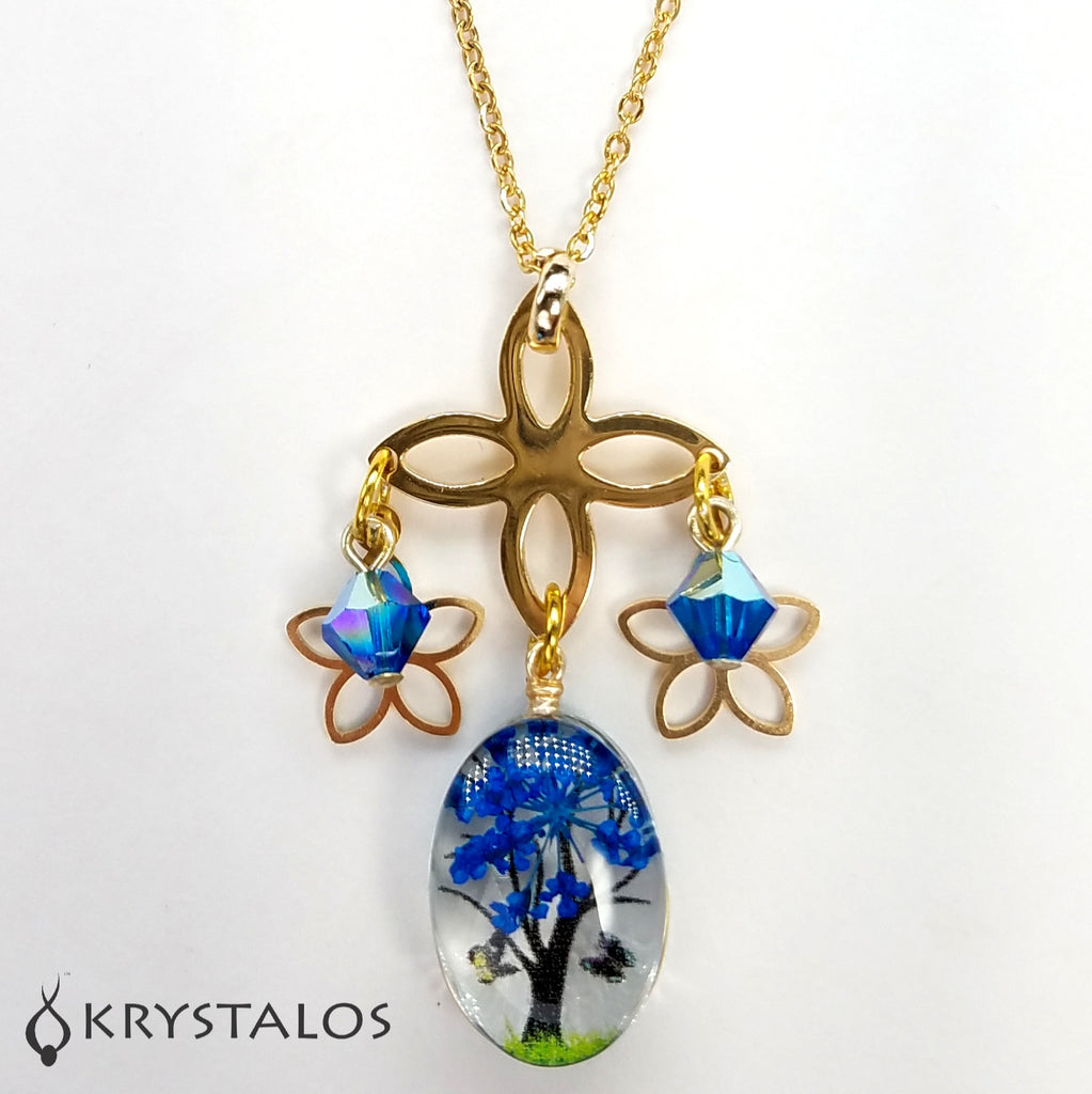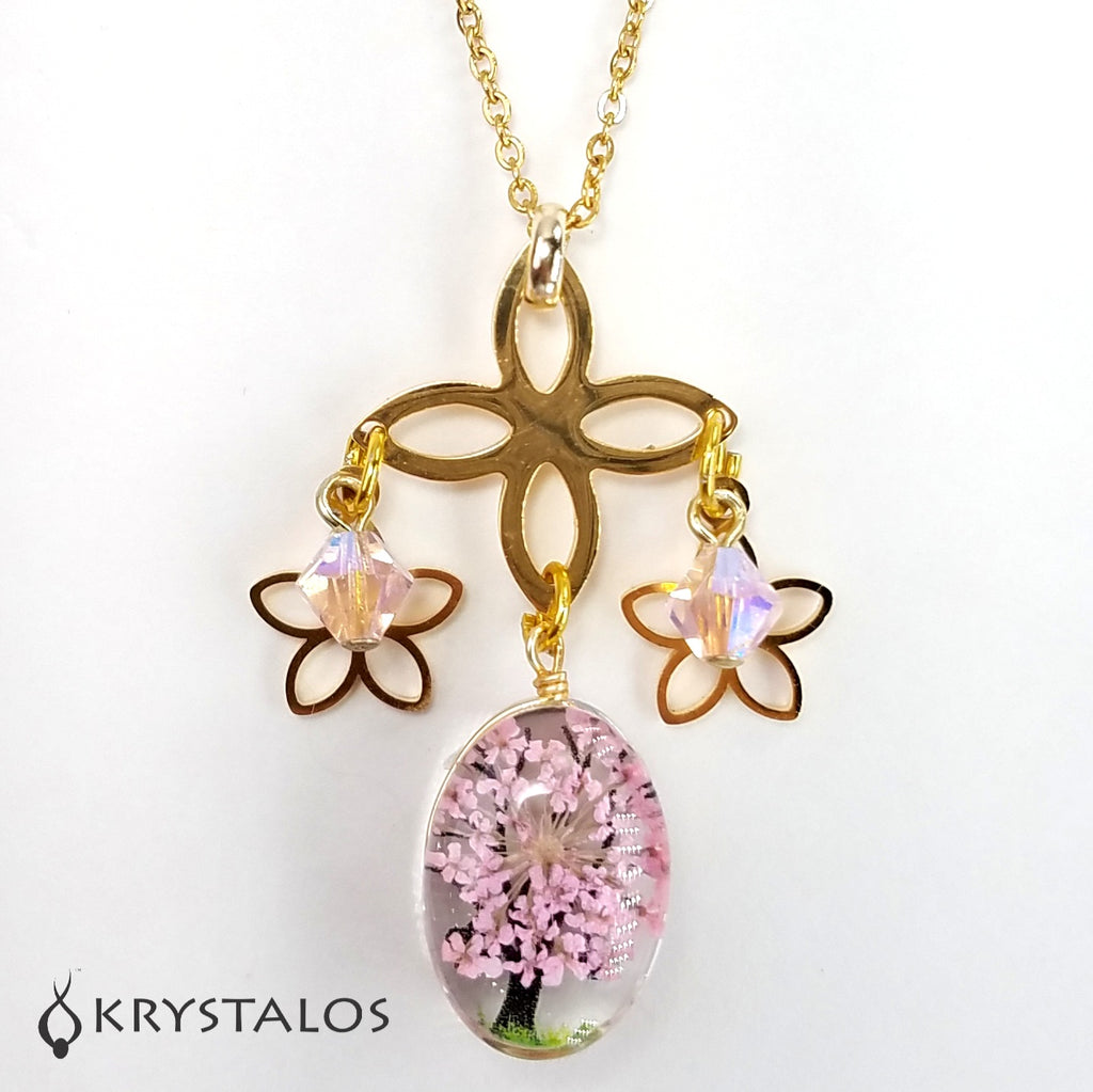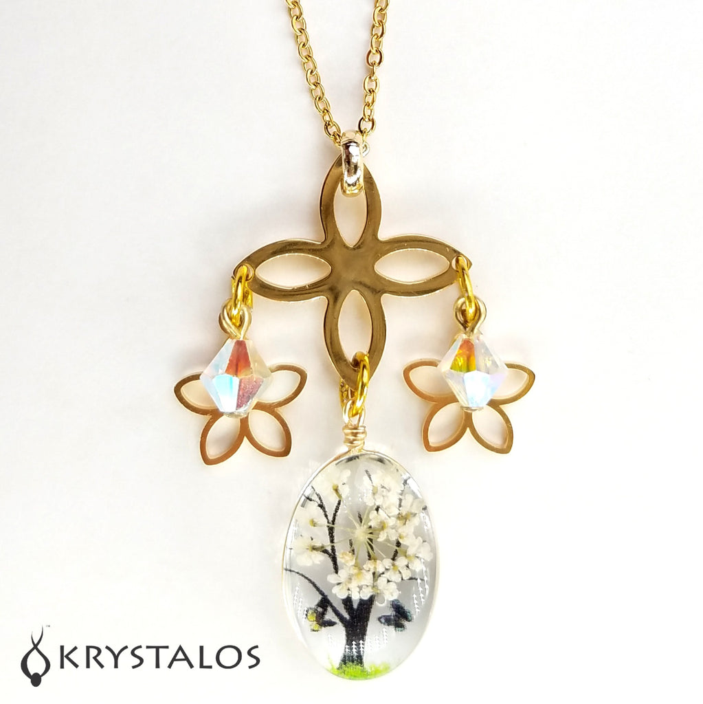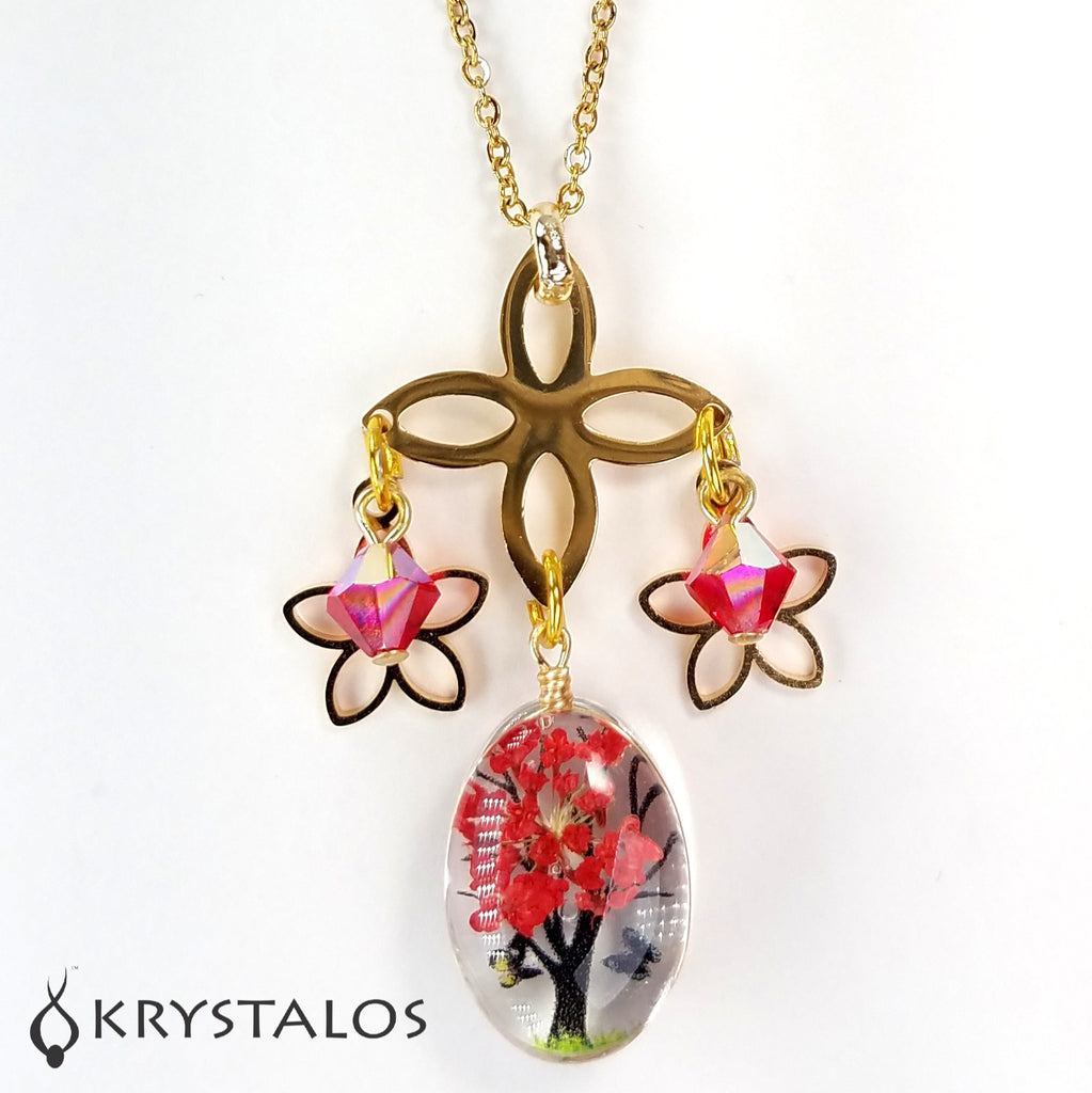 Collar en "Stainless Steel" (acero inoxidable) dorado con cristales austriacos boreales genuinos con enganches enchapados en oro 18K esmaltado, colgante en delicado arbolito esmaltado y flores también en "Stainless Steel" dorado. Cadena en "Stainless Steel" disponible en 2 largos: 17.8" y 29".