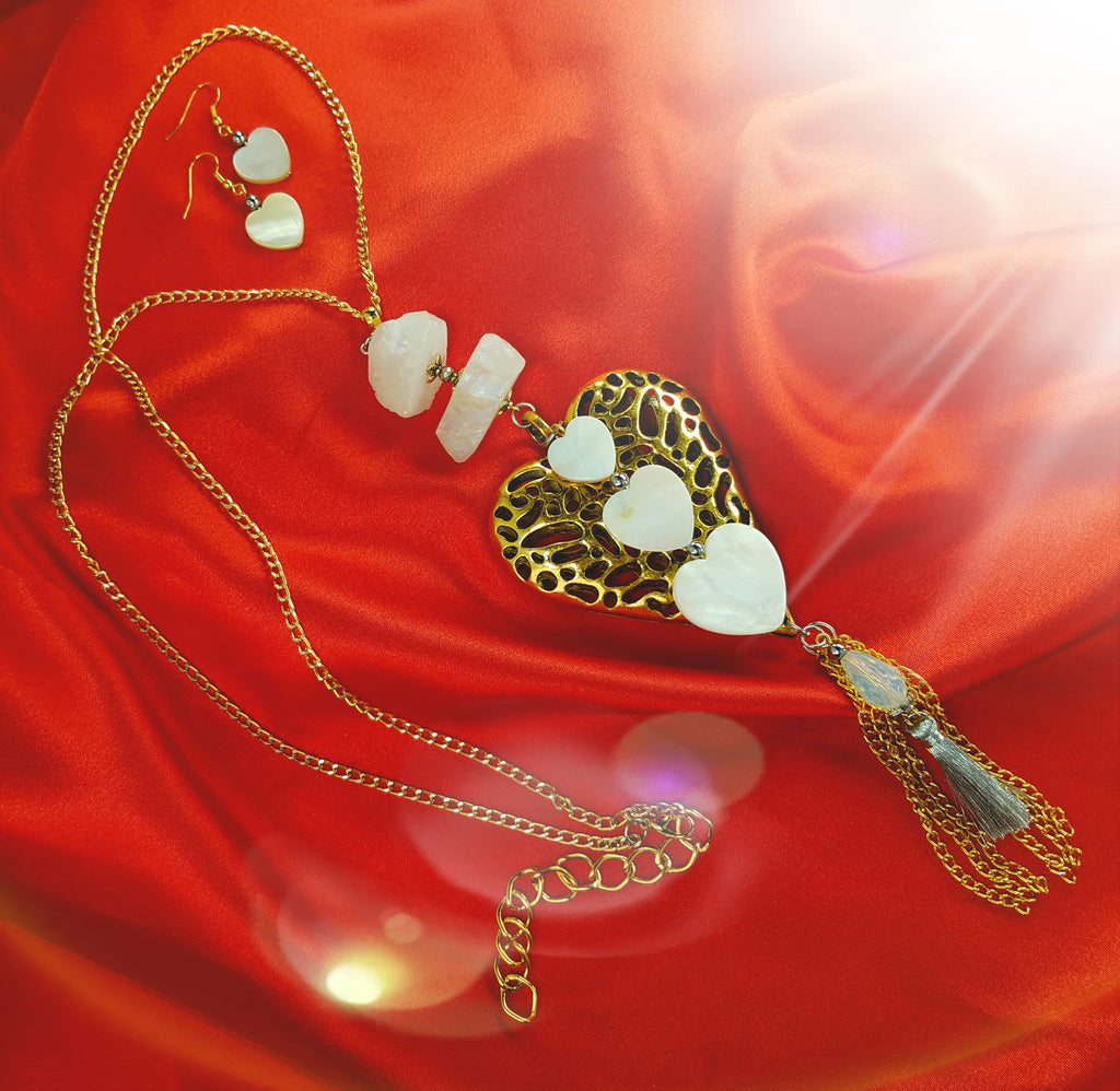 Lujoso set de collar y aretes fabricado con cuarzo boreal, hematitas, madreperla, cristal facetado, y componentes en Stainless Steel y enchape en Oro 18K. Cadena en aluminio que no se descolora y otros componentes metálicos esmaltados.