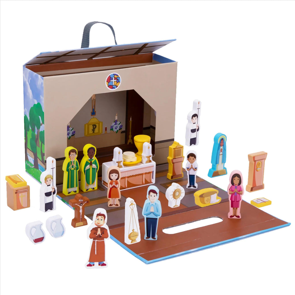 Con piezas hechas de madera ecológica y sostenible, este Kit de la Santa Misa cuenta con 28 figuras brillantes e irrompibles para que tu hijo explore. En la caja con cierre magnético, que representa la Iglesia Católica, se guardan las 28 piezas para recogerlas fácilmente luego de jugar, y el mango resistente lo hace ideal para un fácil transporte.