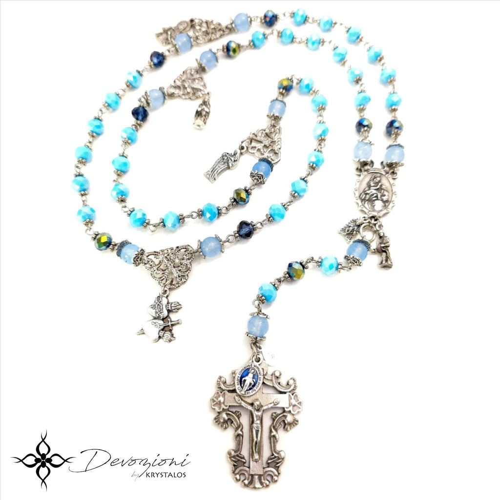 Todas estas medallas y el crucifijo son originales italianas y su construcción es en STAINLESS STEEL. Está compuesto también por cristales facetados, jades teñidos y metales esmaltados.