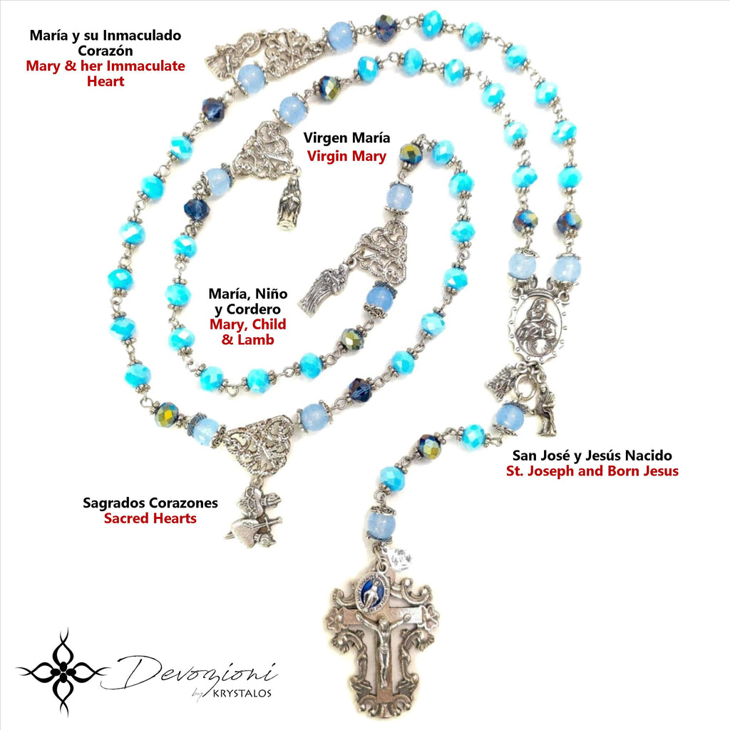 El centro del Rosario, adornado con una hermosa corona, muestra una hermosa estampa de María y el Niño Jesús. Bajo éste se encuentran San José con Jesús en el pesebre, recordándonos el momento en que María se convirtió en Madre del Salvador y Madre nuestra.