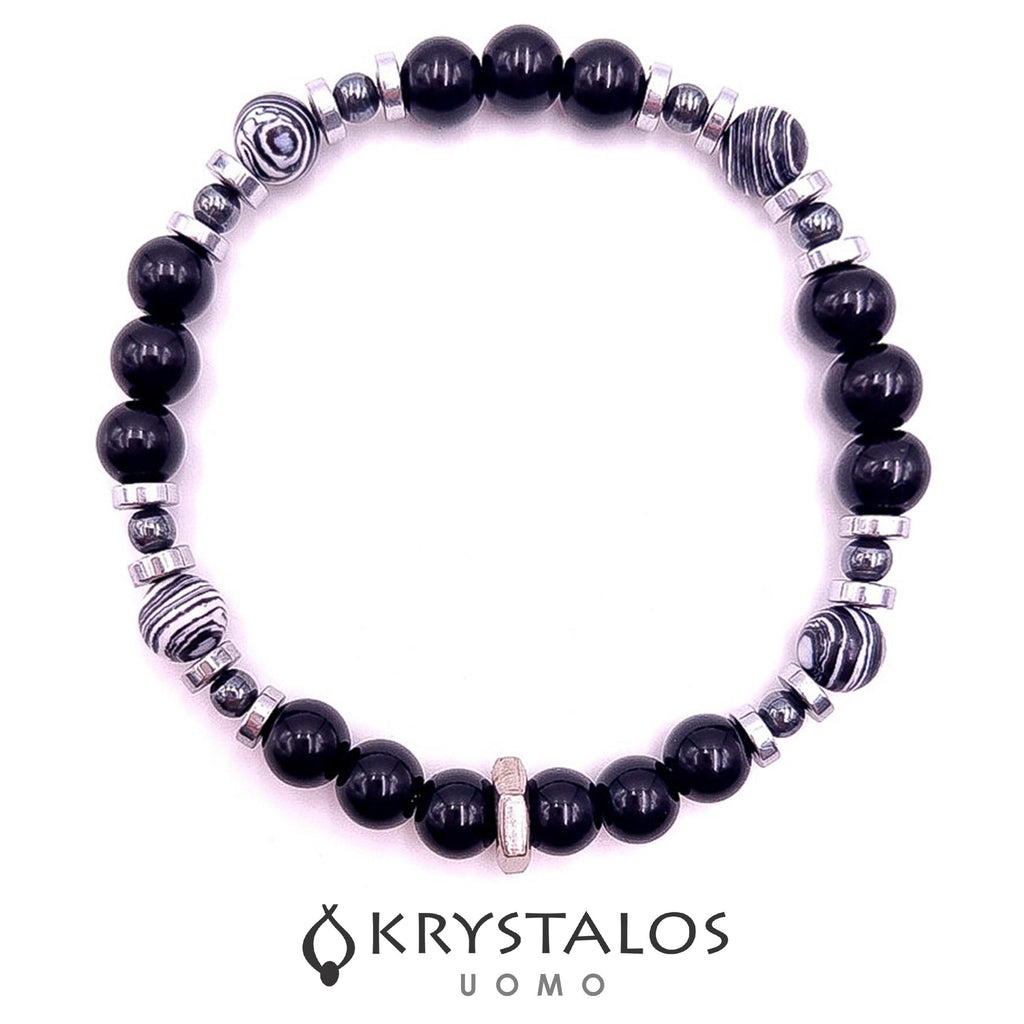 Men's expandable bracelet in hematites, stained jades, malachites and stainless steel detail as focal point. Approximate circumference at rest: 8", expandable to approximately 8.5".