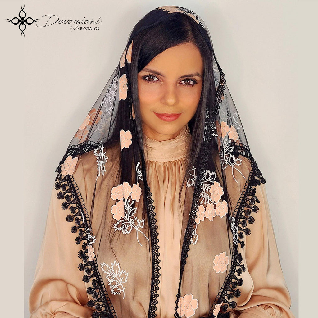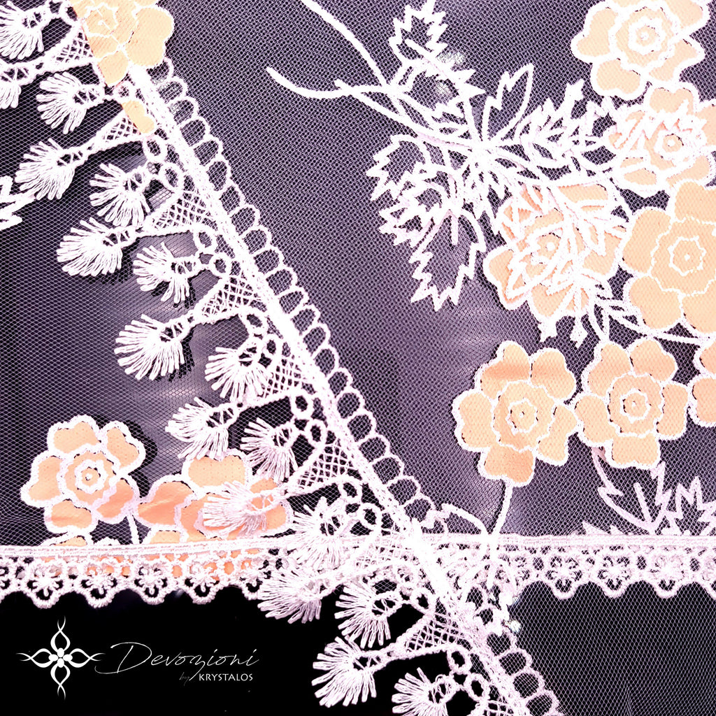 Questo splendido velo in pizzo e tulle è decorato con bellissime rose in una delicata tonalità di rosa . Dimensioni approssimative: 60″ di lunghezza x 22″ di larghezza. Scegli tra bianco e nero. IMPORTANTE: lavare esclusivamente a mano, stendere ad asciugare.