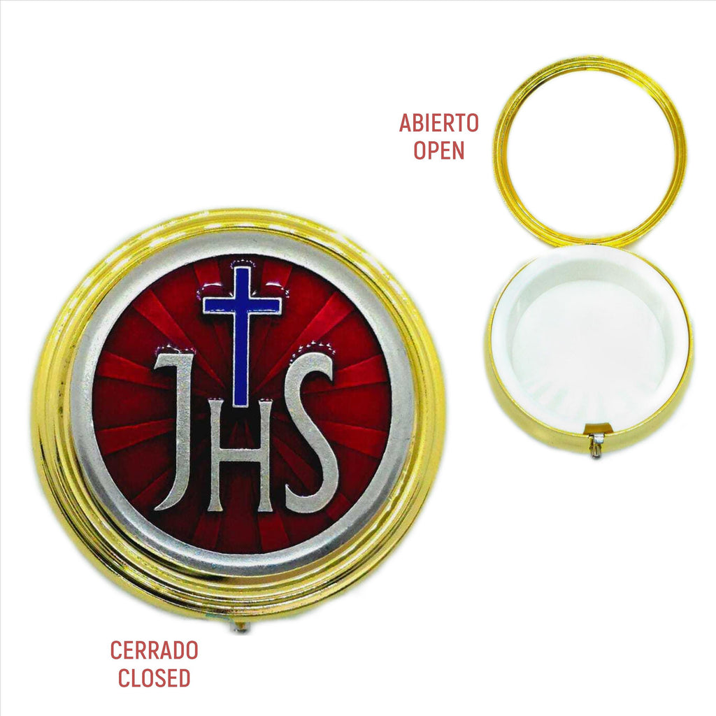 La pisside è un piccolo contenitore in cui viene conservata e custodita la Santa Eucaristia per portarla ai malati. Questa pisside in rilievo smaltata colorata JHS con croce è un bellissimo regalo per un sacerdote o un ministro straordinario dell'Eucaristia. Misure approssimative: 2,38” x 2,38” x 0,86”.