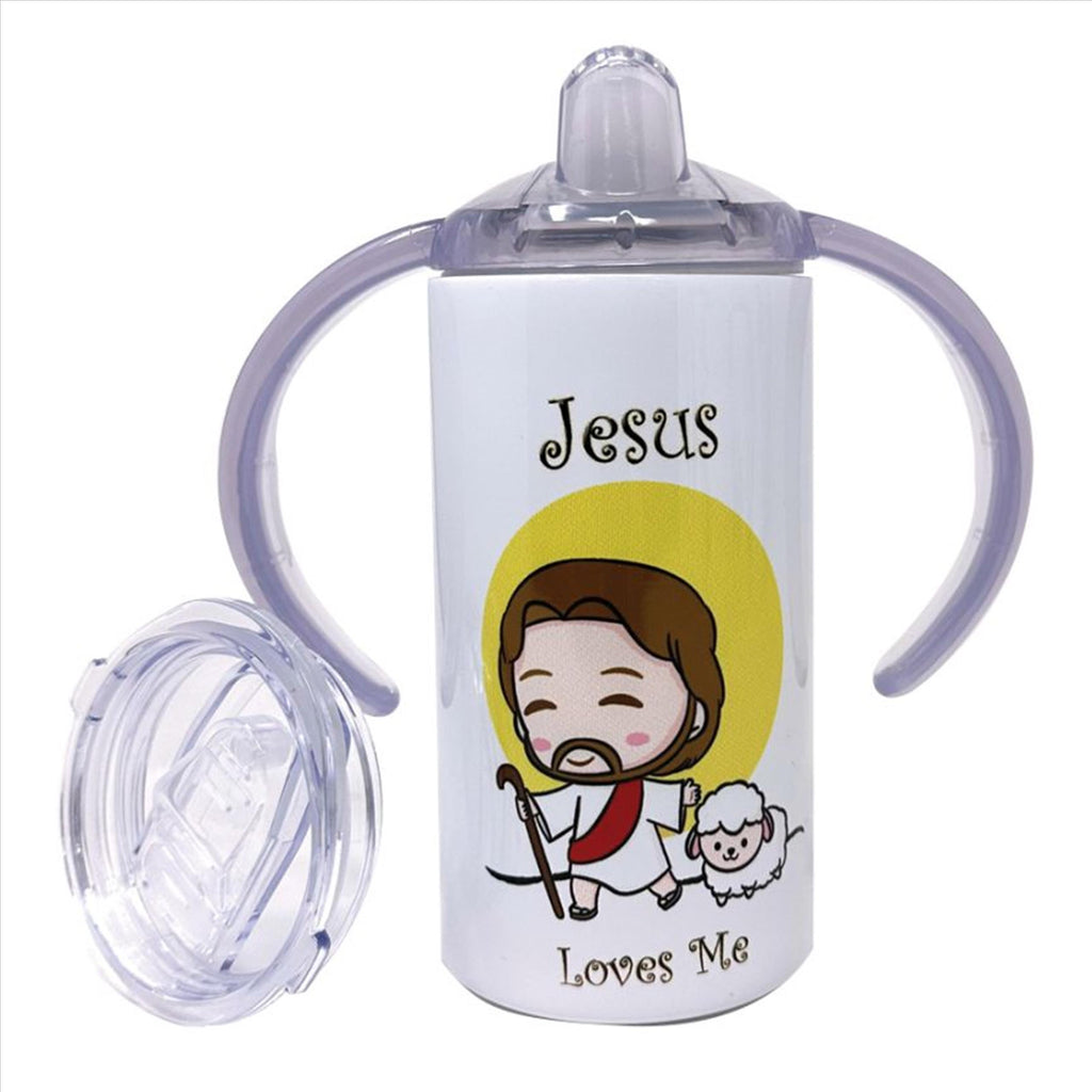 Copo de 12 oz com tampa à prova de derramamento. Lindo motivo colorido de Jesus, o Bom Pastor. Inclui 2 tampas que você pode trocar de acordo com o crescimento do seu filho. Interior em aço inoxidável. Pode conter bebidas quentes ou frias. Material de qualidade alimentar, livre de BPA.